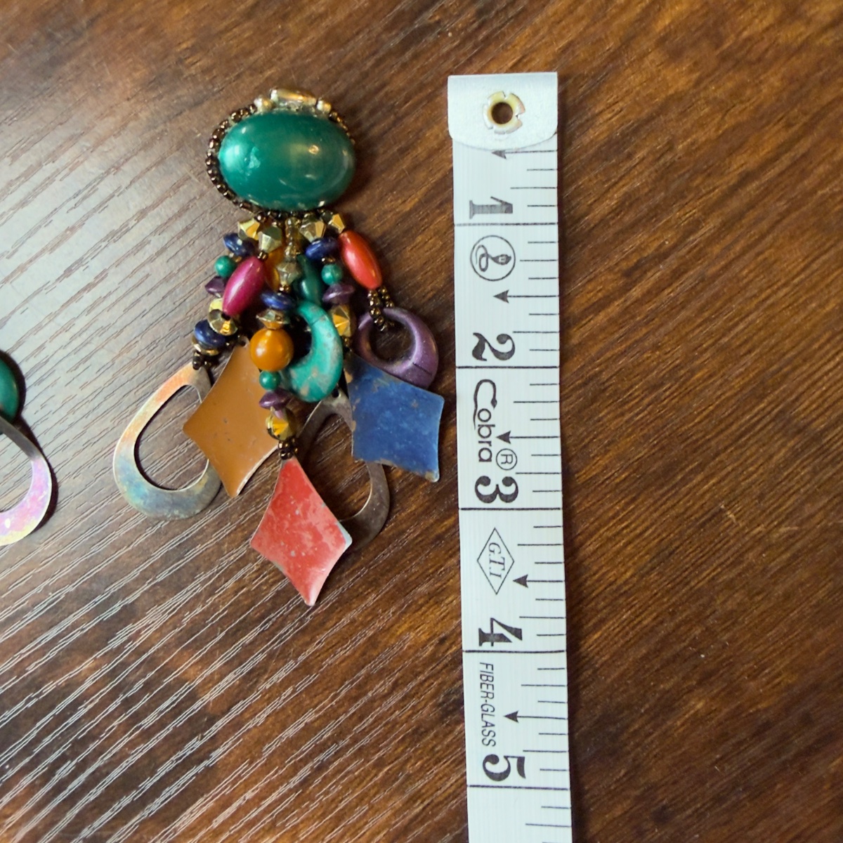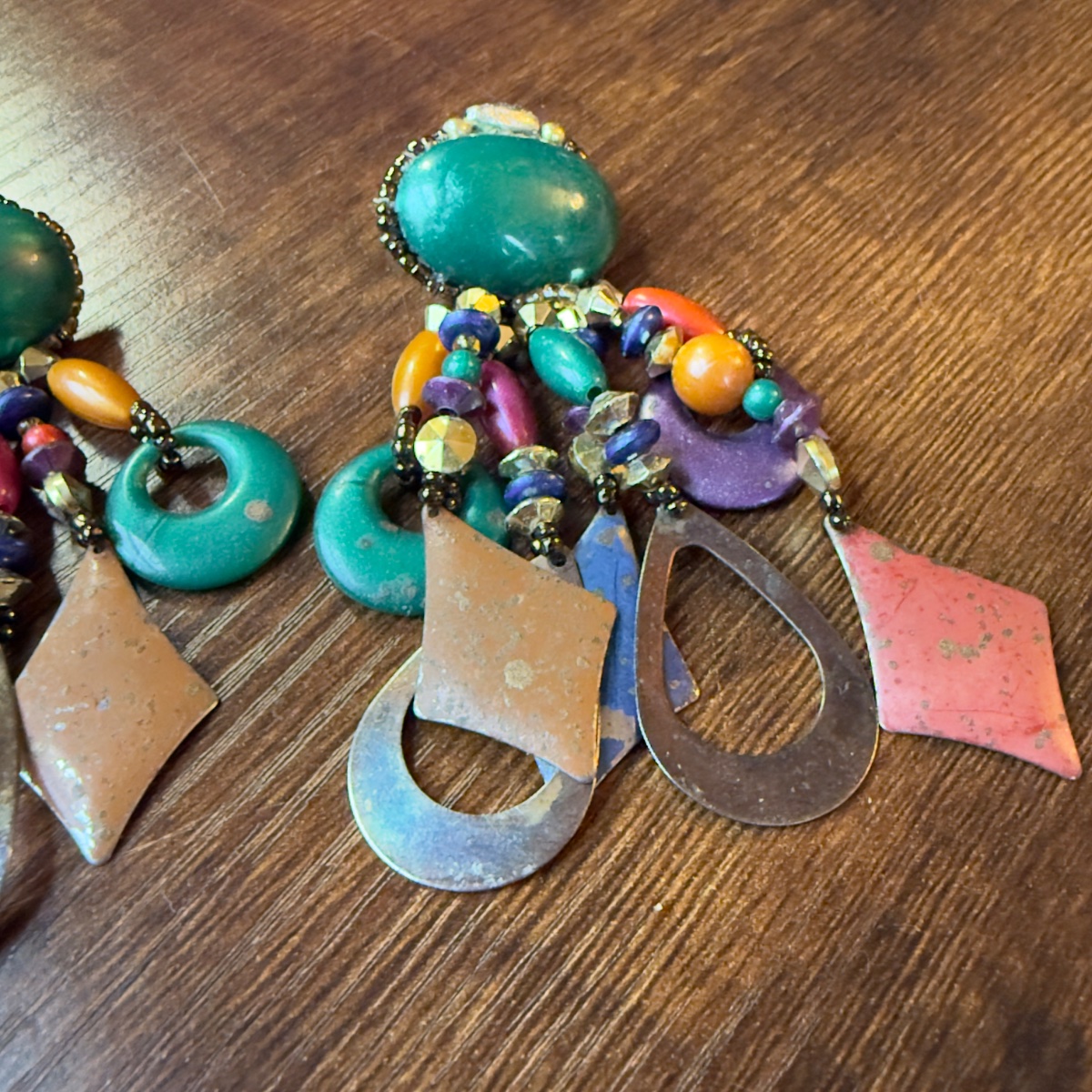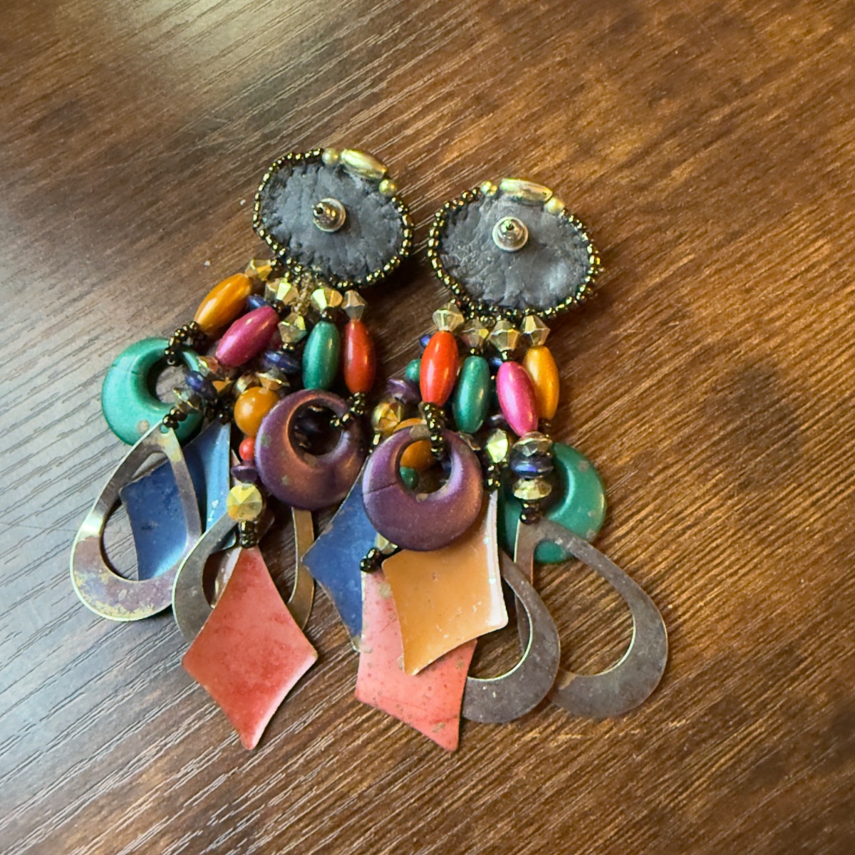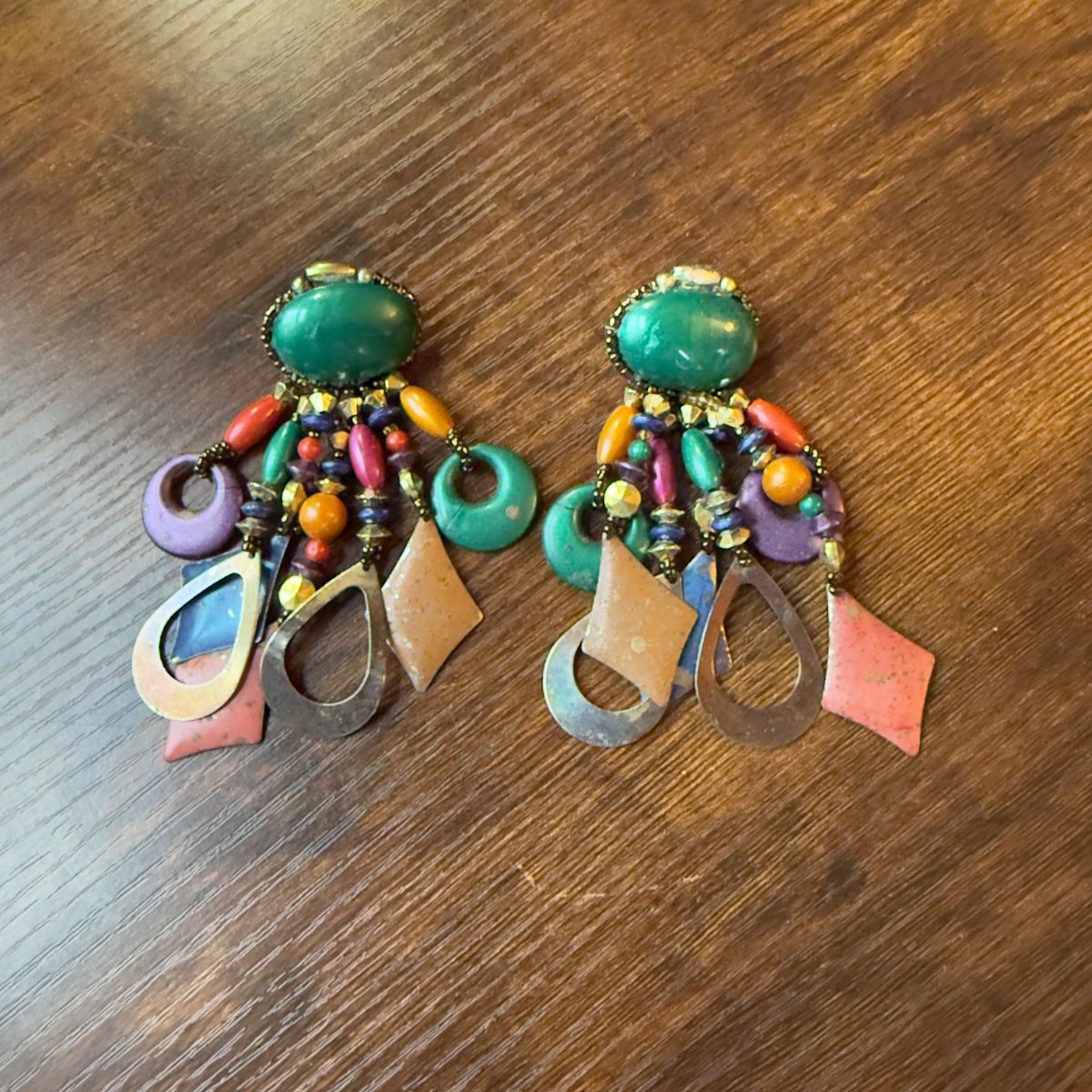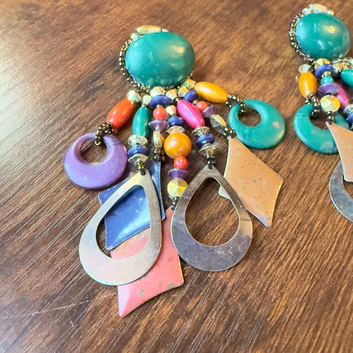 The earrings appear to be in good vintage condition. As unsigned artisan pieces, the value is driven by their 'maximalist' aesthetic and the current high demand for 80s/90s statement jewelry.