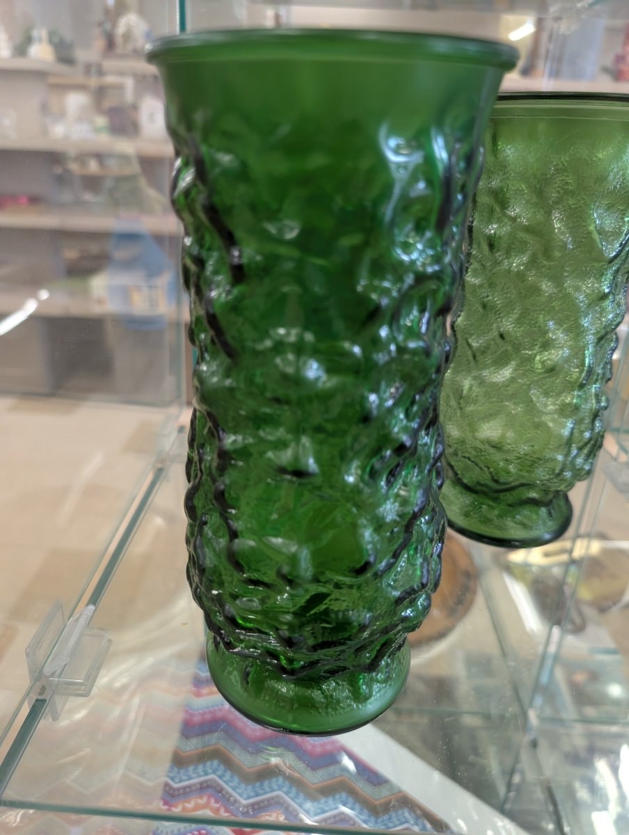 A heavy, mold-blown art glass vase featuring a deep emerald green hue and a rugged, organic 'bark' texture. This style represents the Brutalist movement in glass, where designers moved away from smooth surfaces…