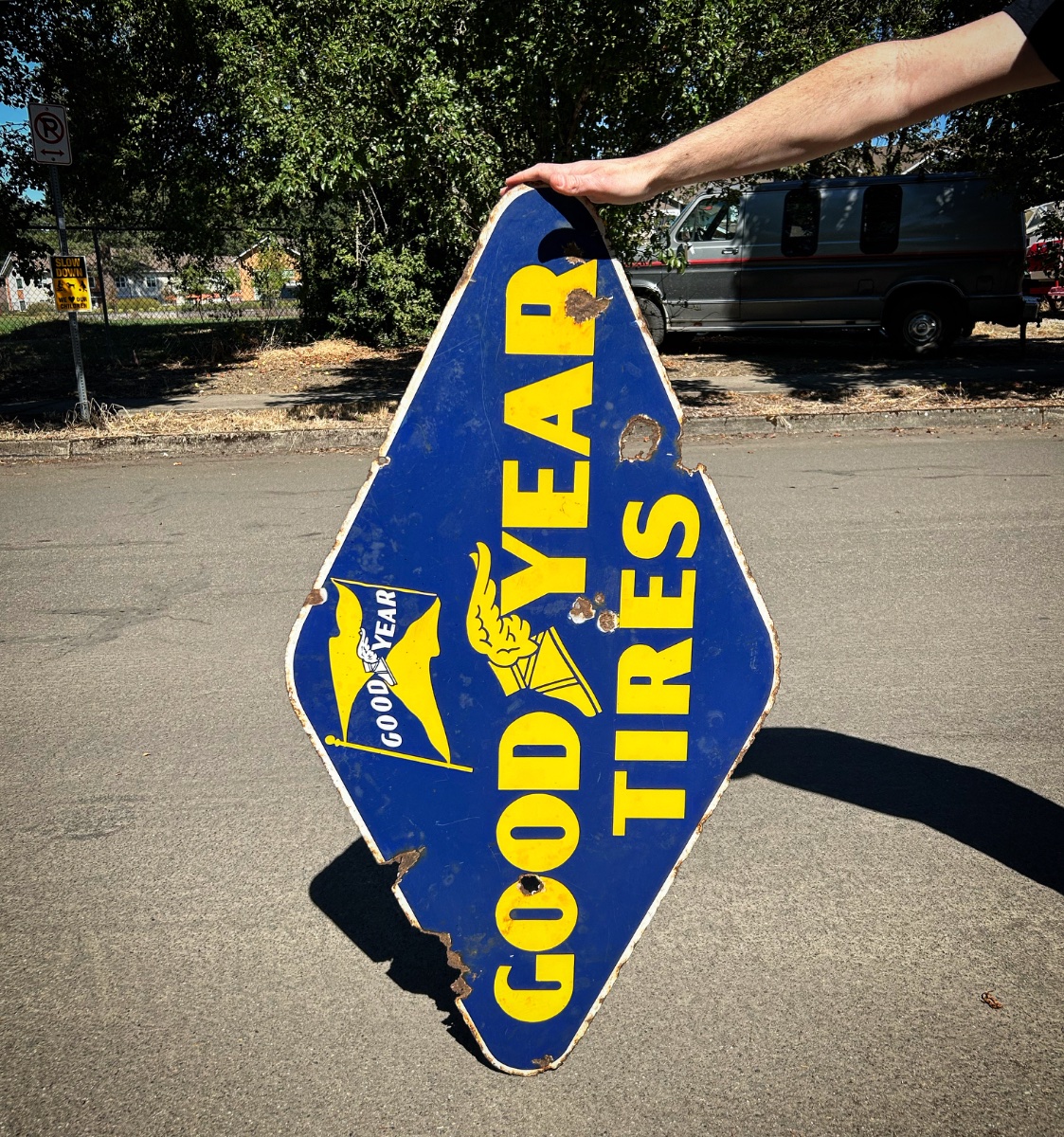 A large-scale vertical diamond advertising sign featuring the iconic Goodyear 'Wingfoot' logo and bold yellow-on-blue porcelain enamel.