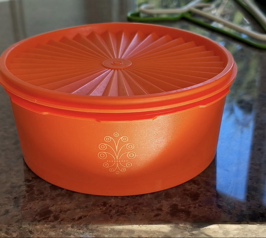 The bowl appears to be in excellent vintage condition with the white graphic still crisp and bright. While Tupperware was mass-produced, the value of this piece is driven by the excellent condition of the white 'Medallion' graphic and the lack of typical 'sticky'…