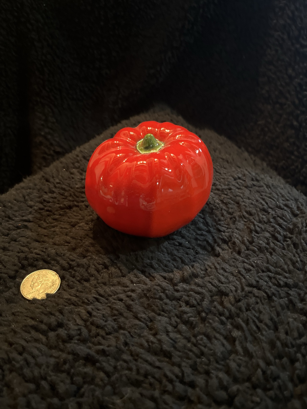 A vibrant, high-gloss ceramic study of a ribbed heirloom tomato, designed in the 'trompe l'oeil' (fool the eye) tradition.