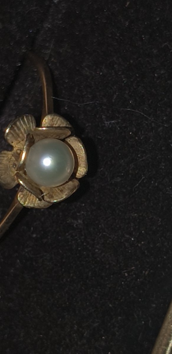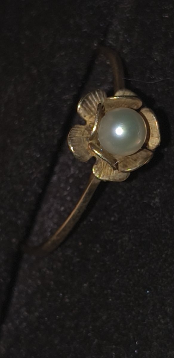 A delicate mid-century cocktail ring featuring a lustrous cultured pearl set within a textured, five-petal gold blossom. The band is slender and elegant, designed to highlight the organic, botanical centerpiece.