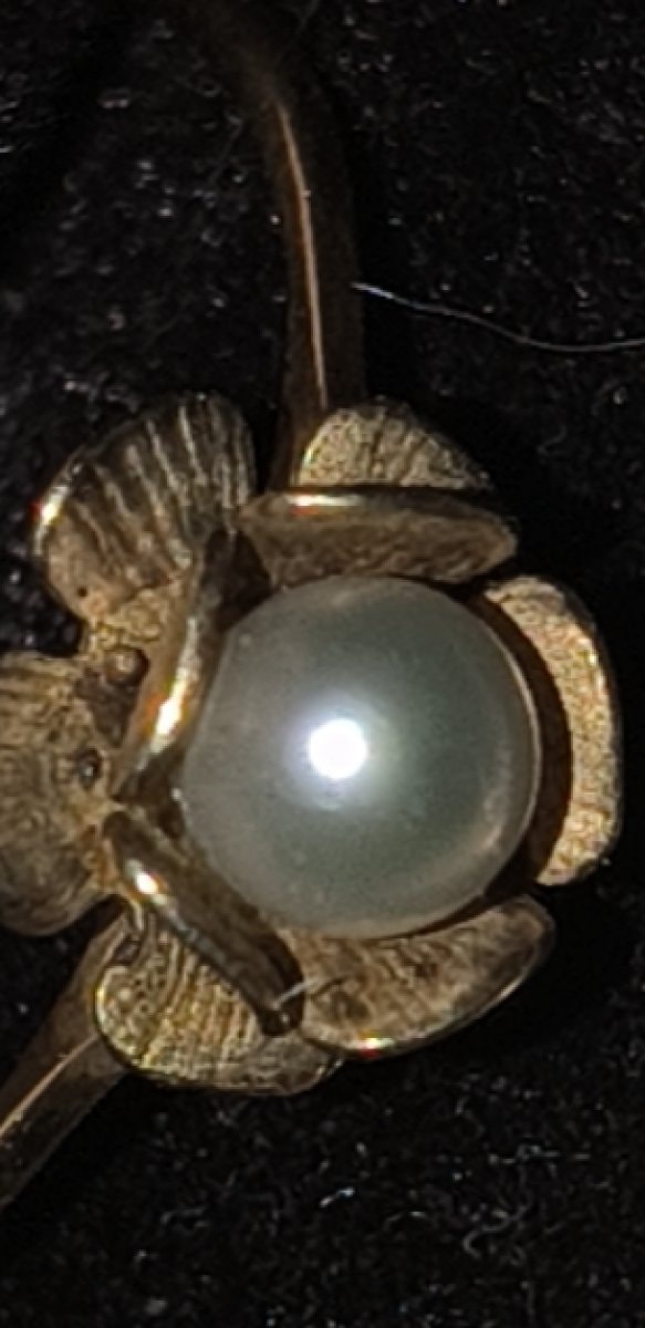 The ring appears to be in excellent vintage condition with the pearl retaining a strong, healthy luster and no visible chips to the nacre. The gold shows light surface wear consistent with age, and the '14K-G' hallmark is crisp and legible. Professional cleaning would easily restore the original brightness of the textured petals.
