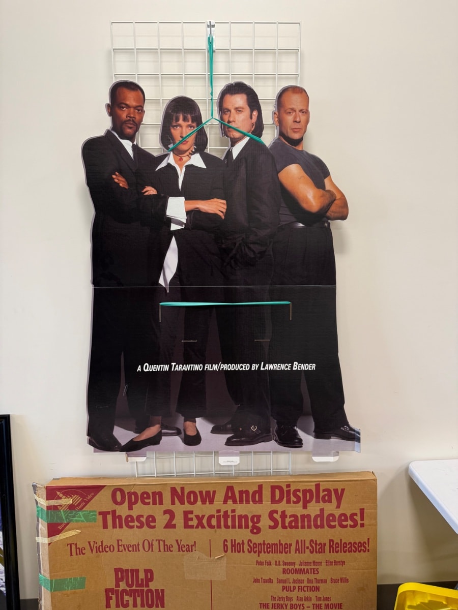 A large-scale lithographed cardboard promotional display featuring the core ensemble cast of Quentin Tarantino's 1994 masterpiece.