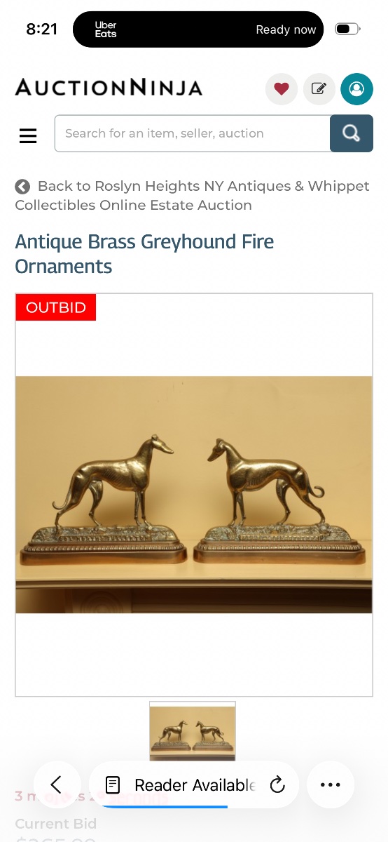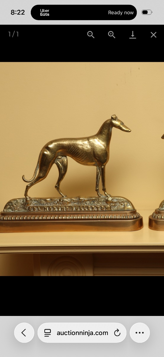A rare pair of cast brass hearth ornaments depicting 'Fullerton,' the most famous racing greyhound of the 19th century.