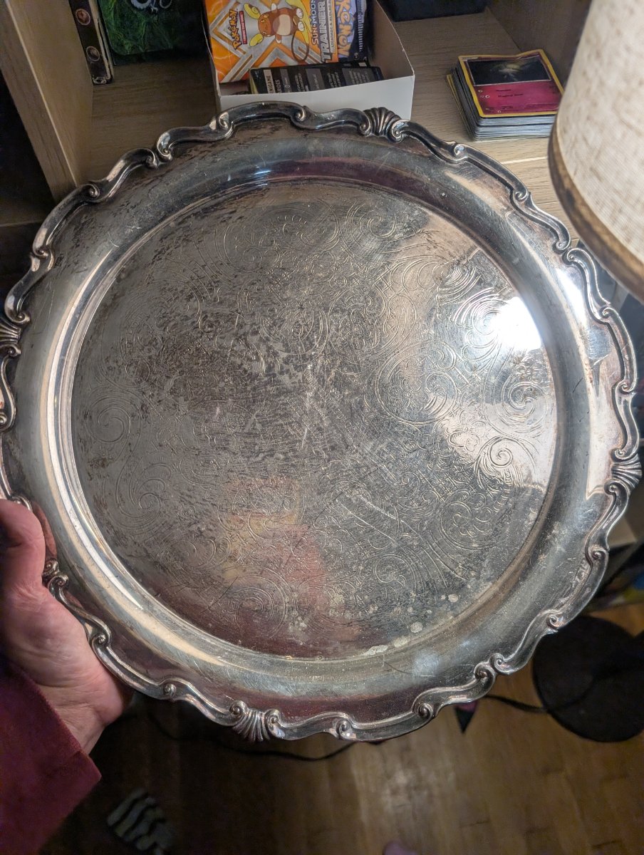 The tray shows visible tarnish and surface oxidation consistent with age and storage. Silver-plated hollowware is currently very affordable as modern lifestyles favor low-maintenance materials.