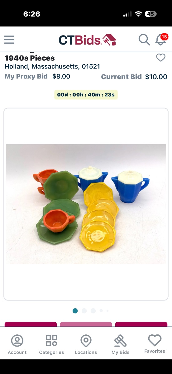 A vibrant, multi-colored miniature tea service crafted from Plaskon, an early urea-formaldehyde plastic known for its saturated, translucent hues.