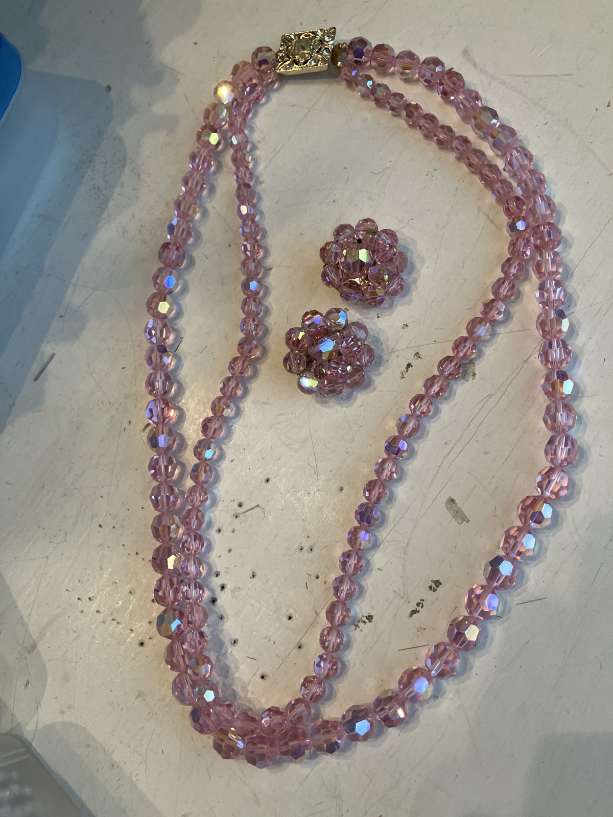 The beads appear to be in excellent condition with no visible 'flea bites' or significant chips. Value is driven by the fact that it is a complete set (necklace and earrings) in a desirable 'millennial pink' hue.