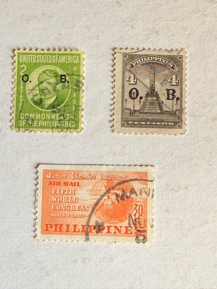 This set includes two 'Official Business' (O.B.) overprinted stamps from the Commonwealth era and one 1950 Air Mail commemorative stamp.
