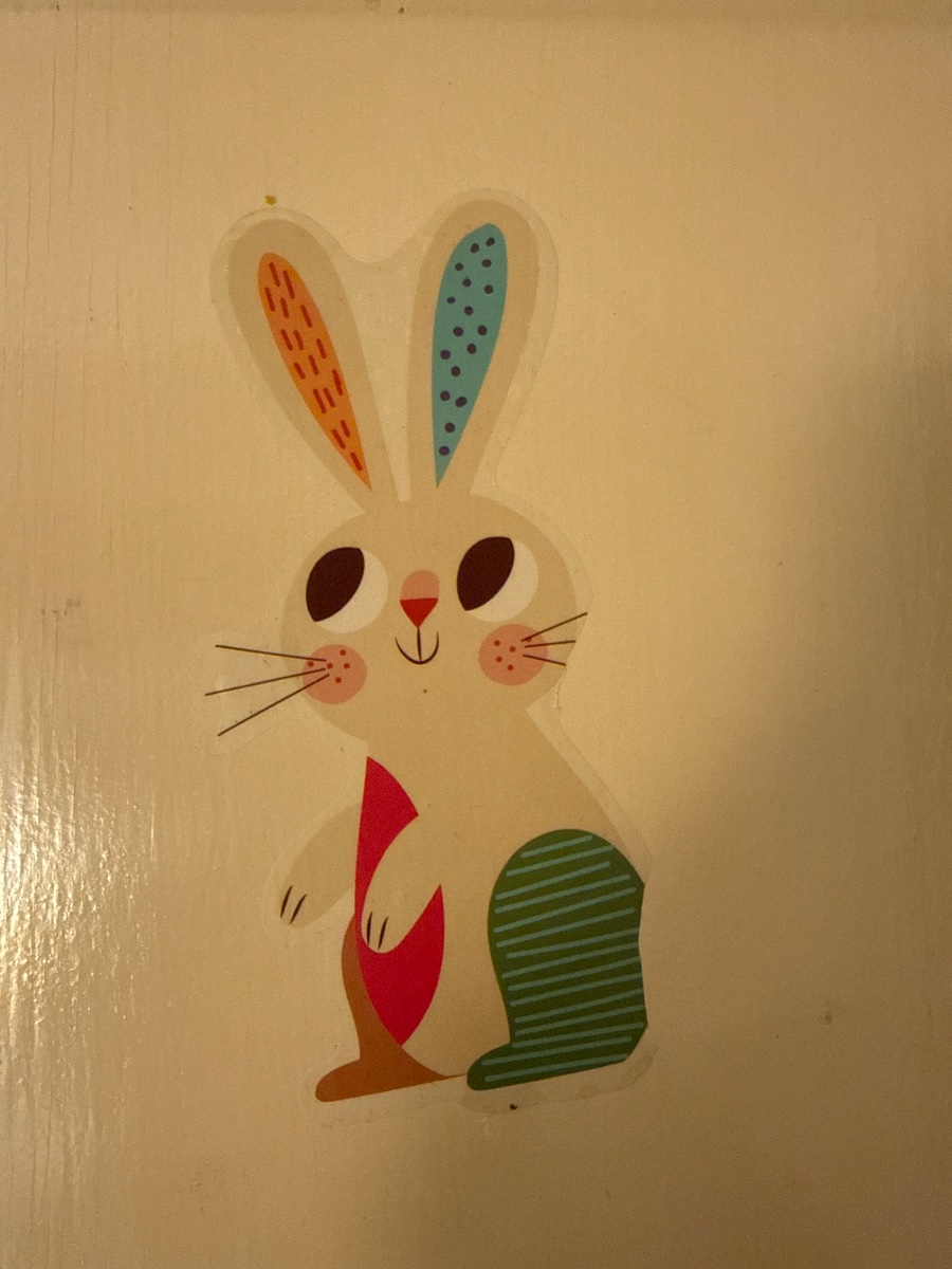 A whimsical, stylized rabbit decal featuring the geometric shapes and bold patterns characteristic of the Mid-Century Modern aesthetic.