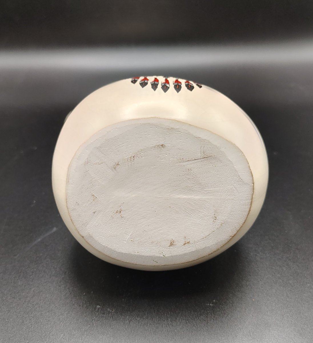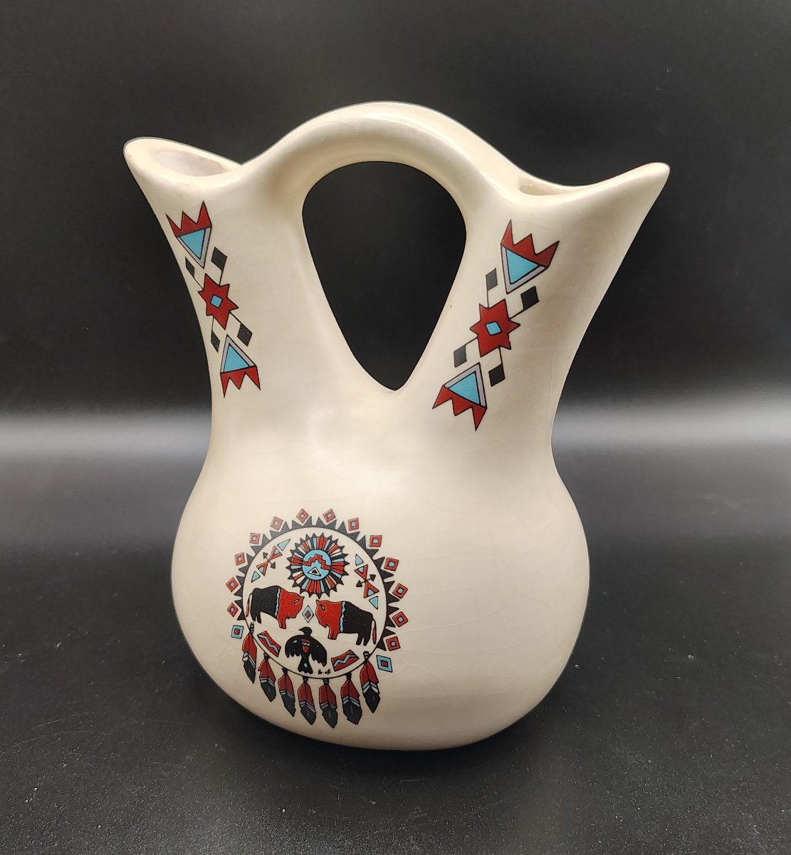 This is a classic 'wedding vase' form, a silhouette deeply rooted in Puebloan tradition, reimagined as a mid-century souvenir.