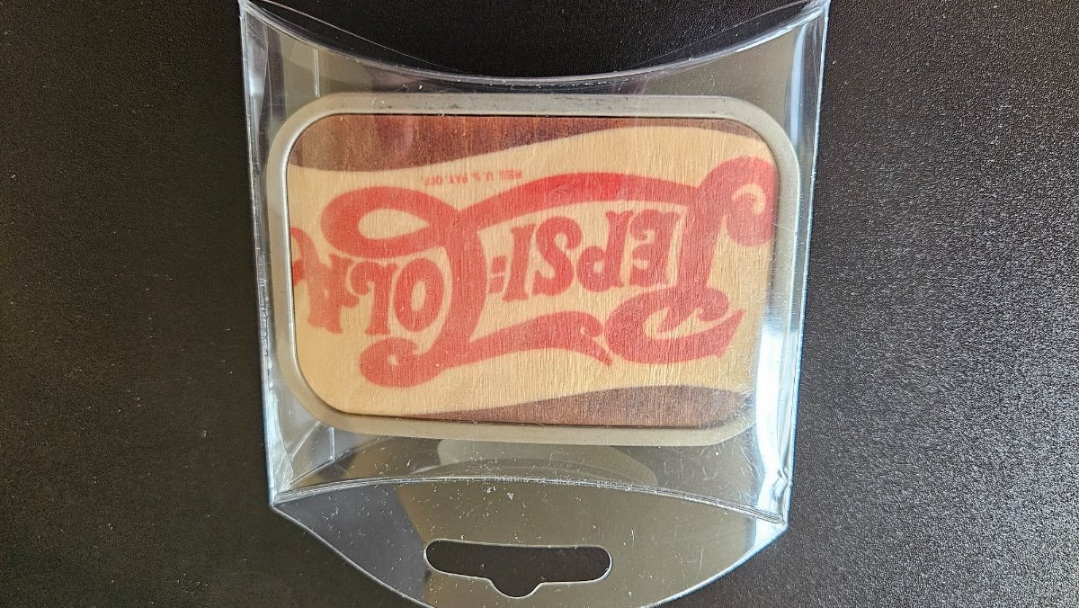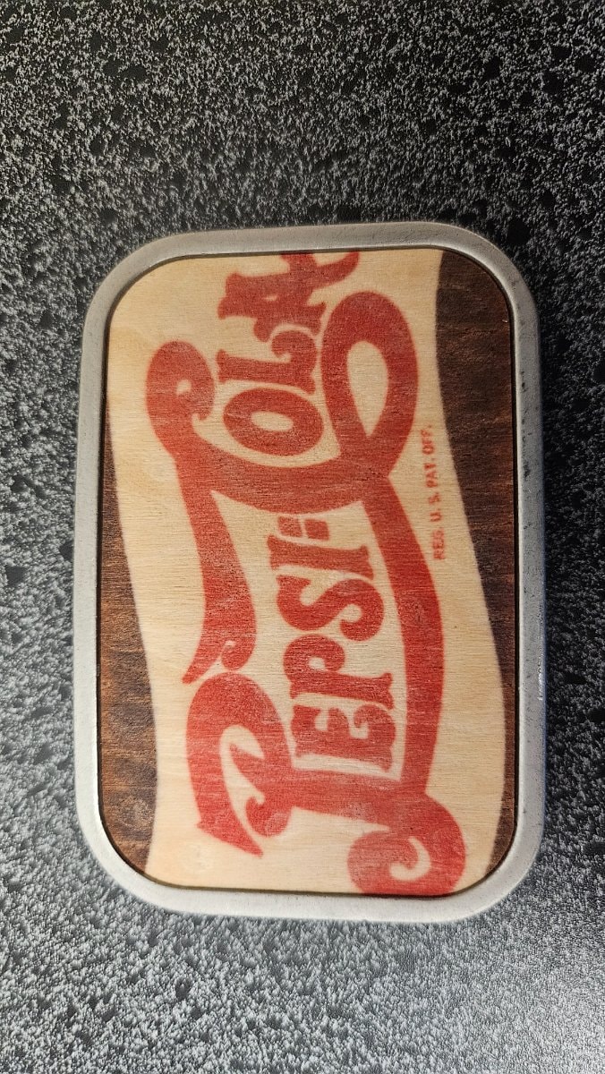 This is a modern licensed collectible featuring a vintage-style 'double dot' Pepsi-Cola script logo printed onto a natural wood veneer inlay.