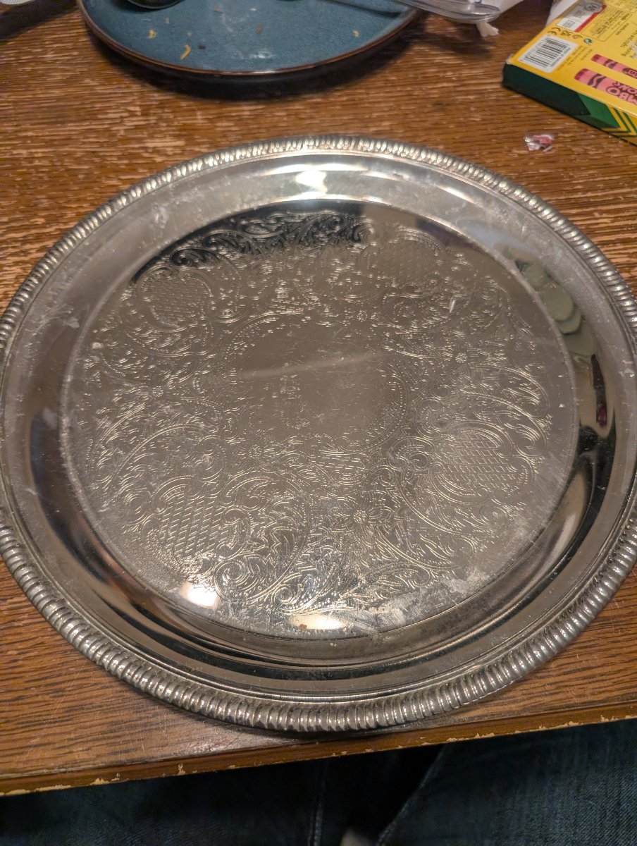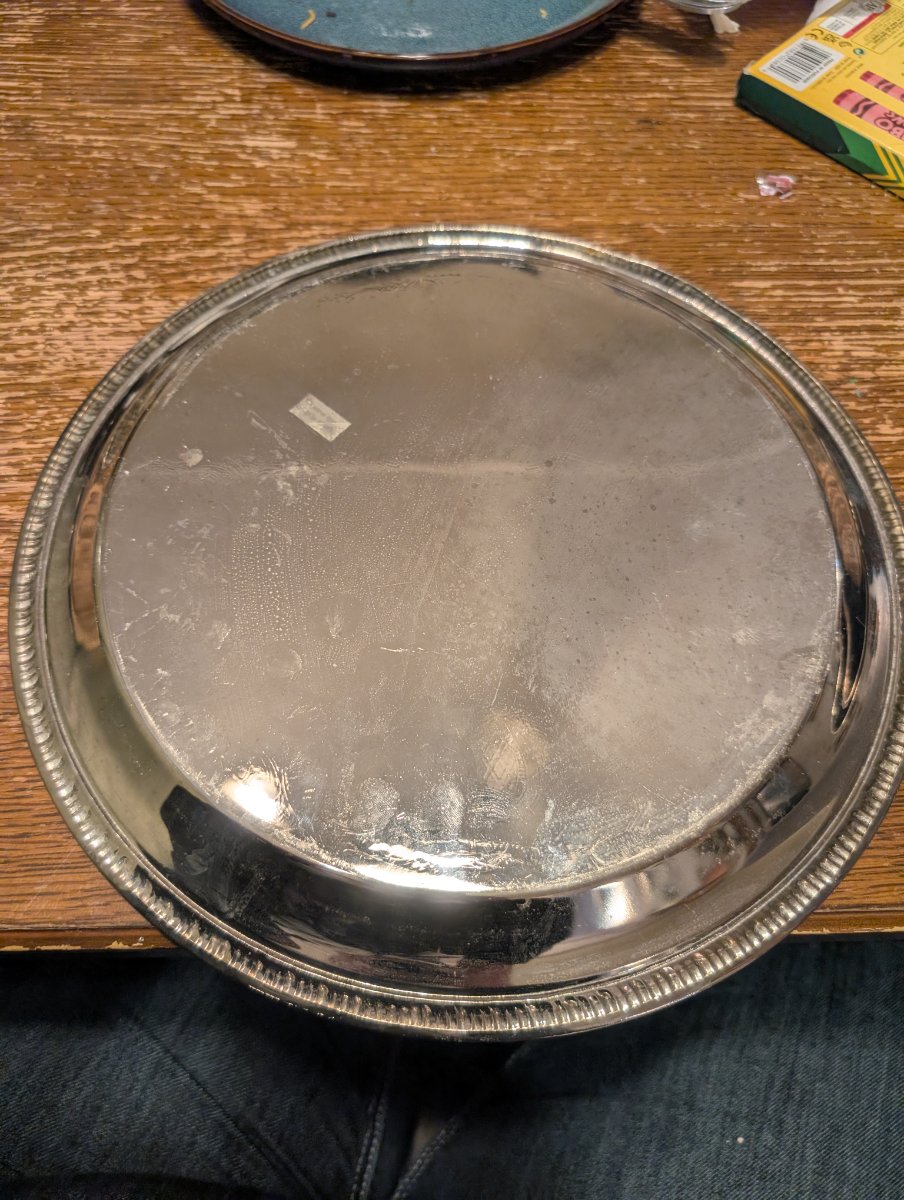 The piece shows significant surface wear, heavy tarnish, and what appears to be 'bleeding'—where the silver layer has worn thin, revealing the base metal underneath. The market for silver-plated hollowware is currently very soft, as modern buyers often prefer dishwasher-safe items.