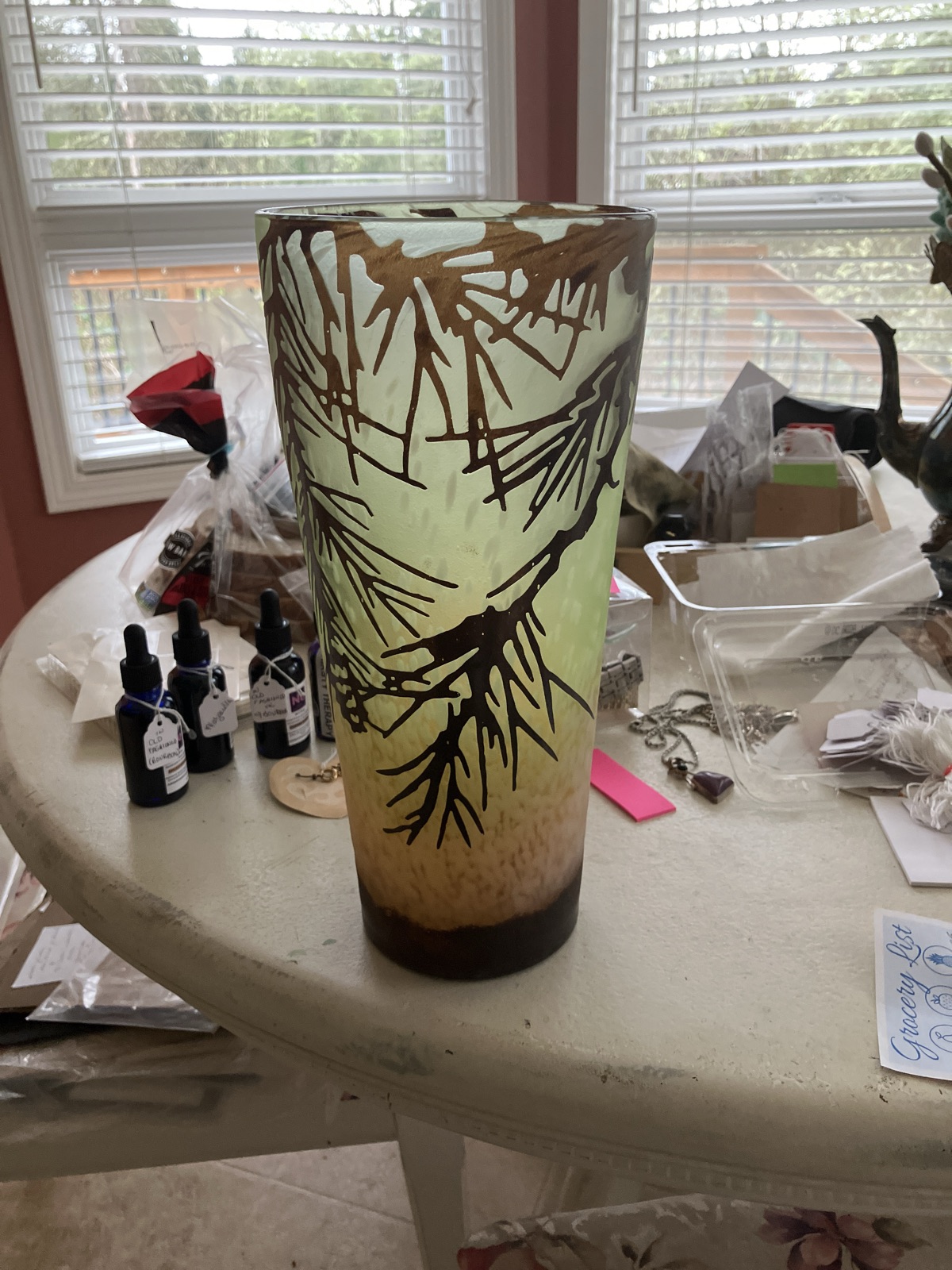 This is a substantial acid-etched cameo glass vase featuring a striking, layered pine needle and branch motif.