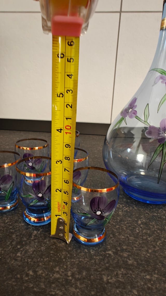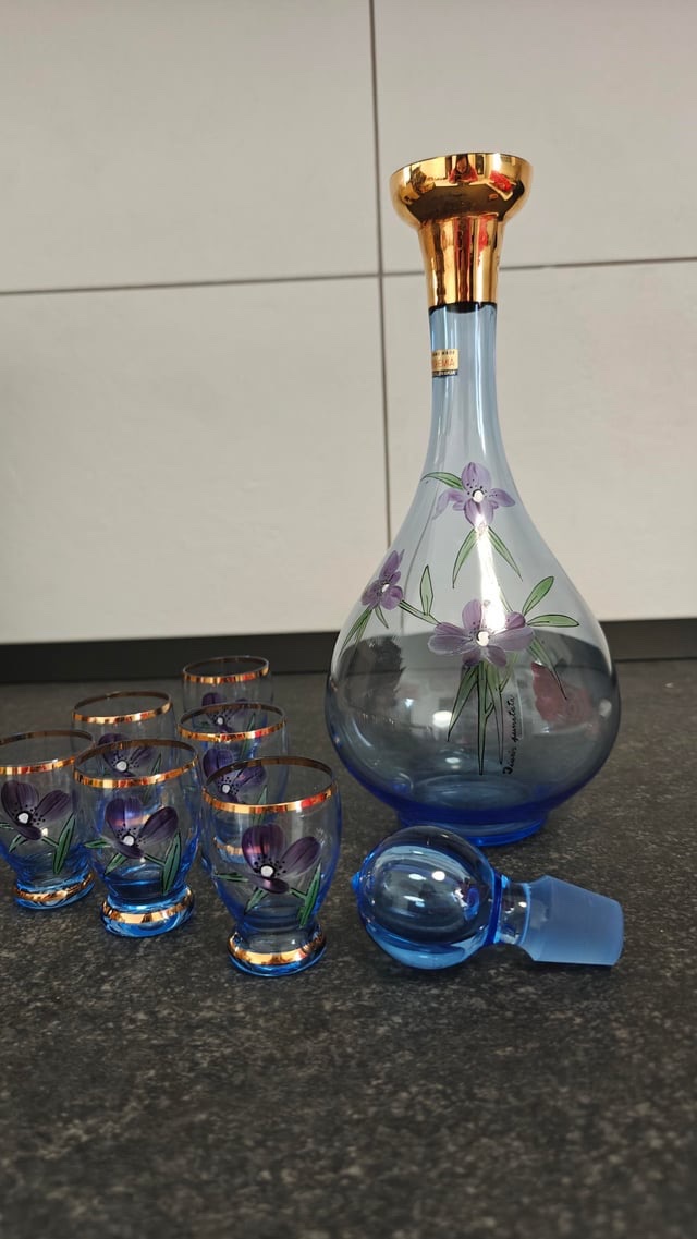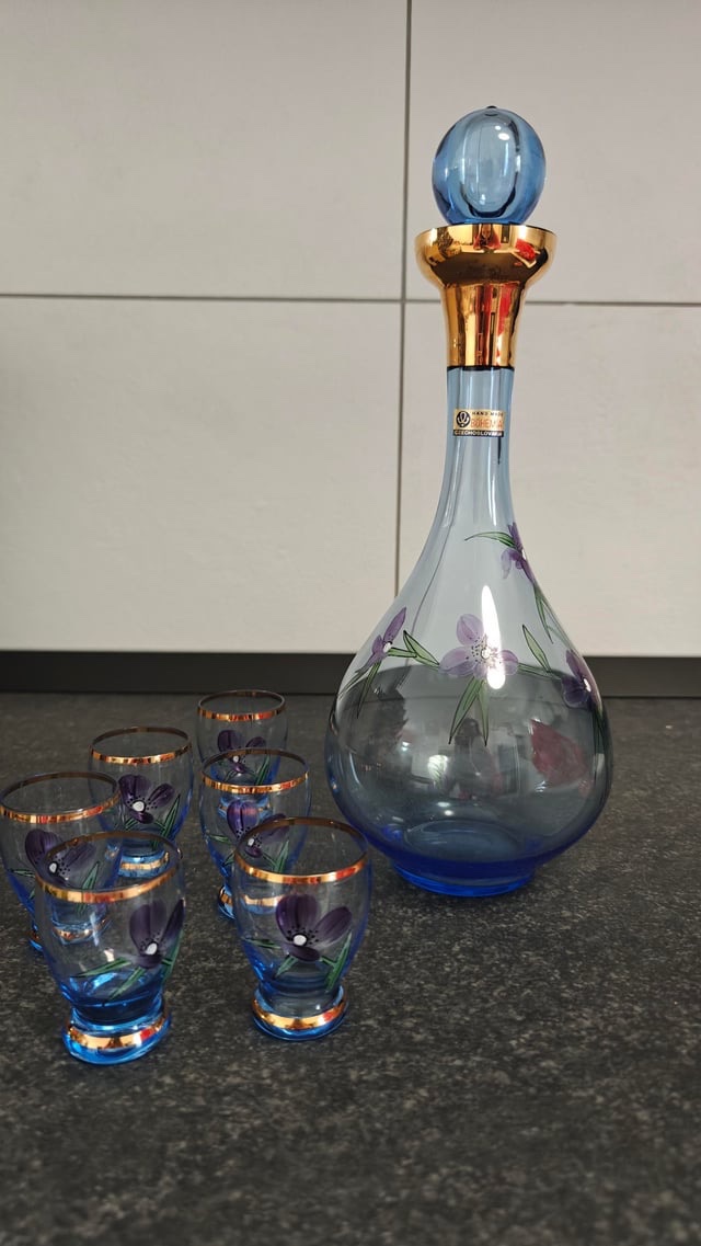 The set appears to be in remarkable condition with the original 'Hand Made' foil sticker still attached, which is a significant find for collectors. Value is driven by the completeness of the set (all 6 glasses plus the original stopper) and the presence of the original foil export sticker.