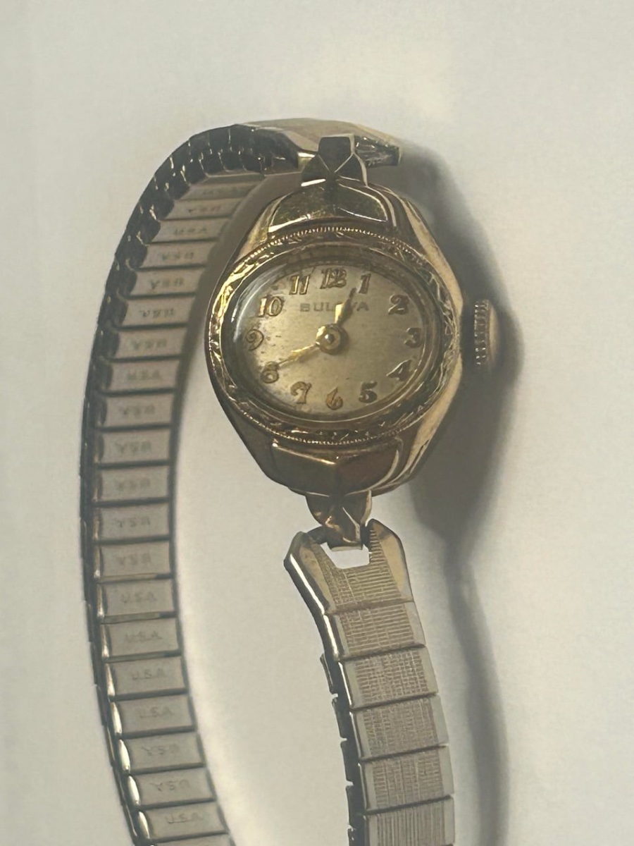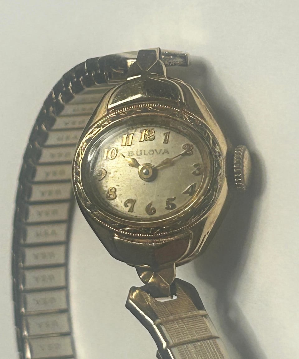 The dial shows significant 'foxing' or spotting, which is a natural oxidation of the lacquer that many collectors find charmingly authentic. Value is driven by the prestigious Bulova brand and the mechanical 17-jewel movement.