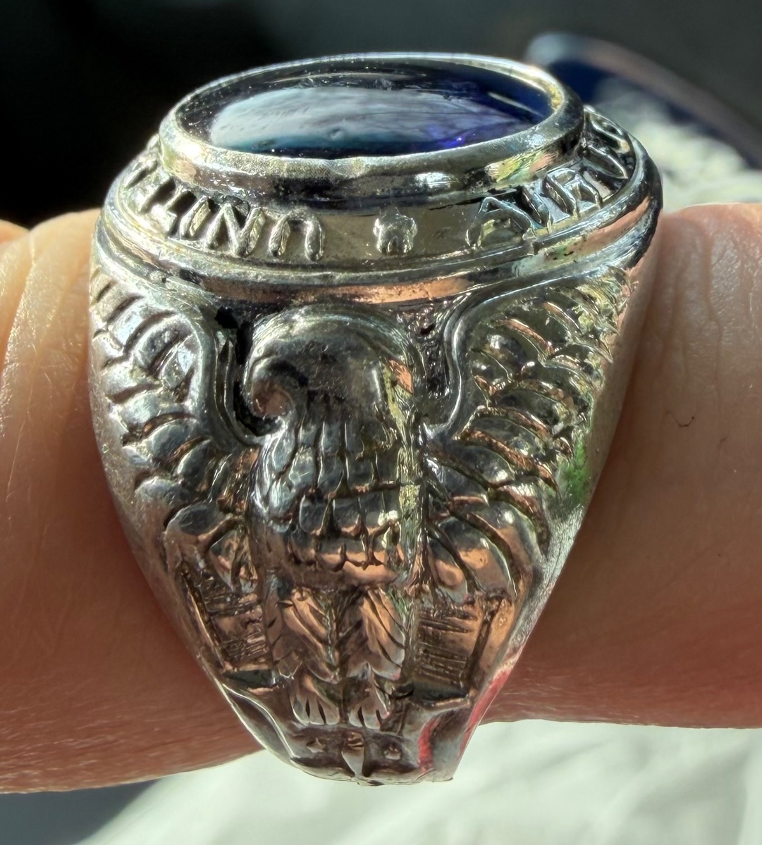 A classic military service ring crafted in sterling silver, featuring a deep blue cabochon stone and high-relief eagle iconography.