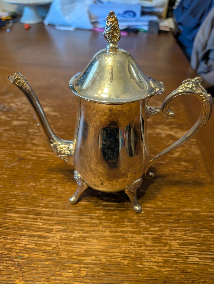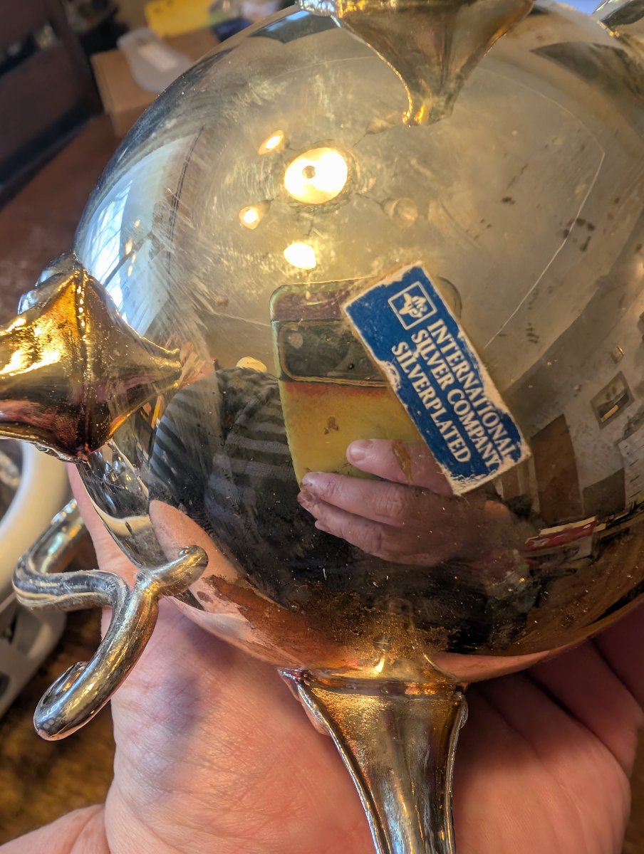 The piece shows significant surface tarnish and some minor scuffing, which is expected for its age. The original sticker is partially intact, which is a rare find. Silverplated hollowware is currently very common in the secondary market, which keeps prices accessible.