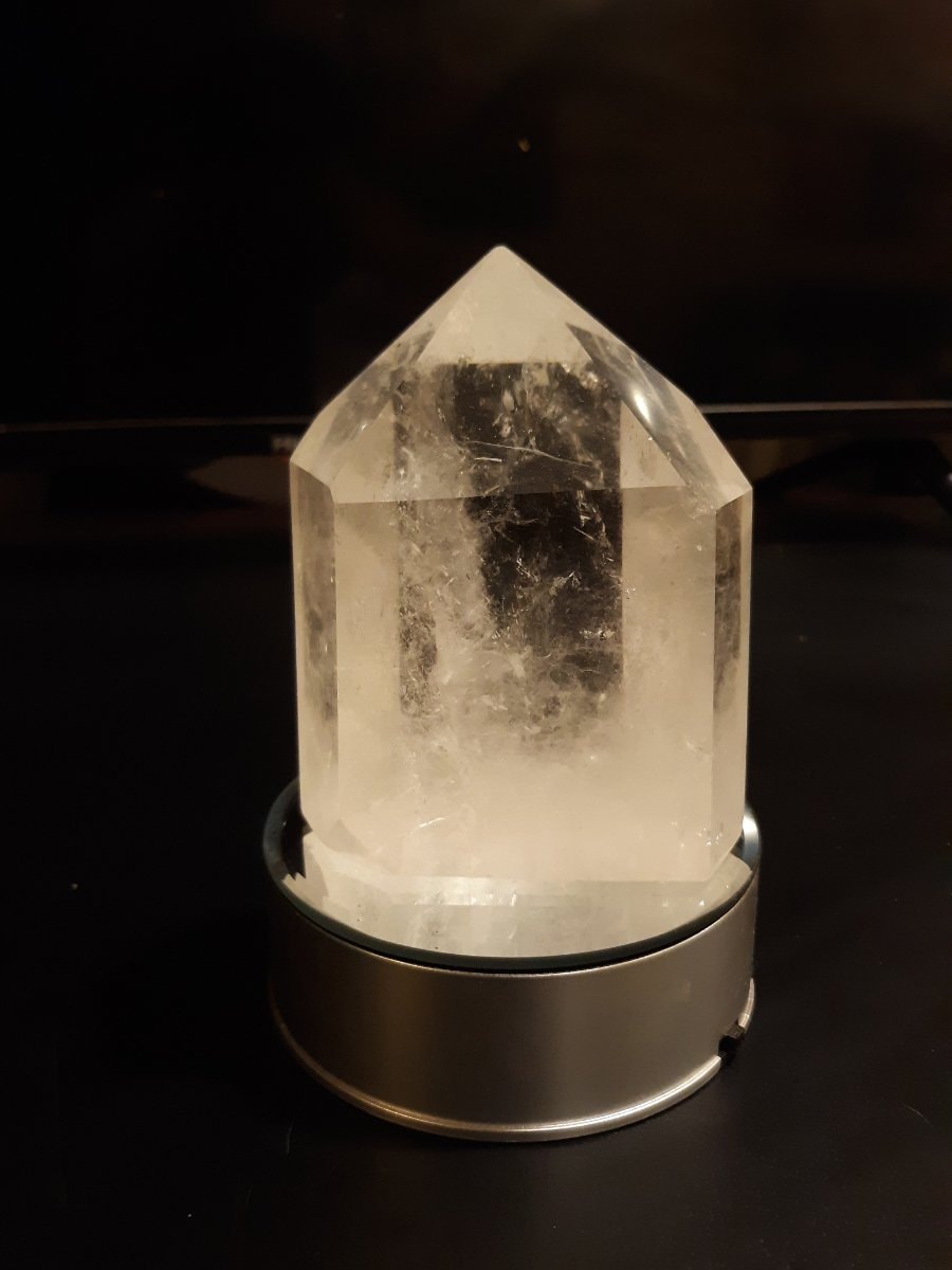 This is a substantial, cut and polished clear quartz crystal point, often referred to as a 'tower' or 'obelisk.' It features natural internal inclusions and 'veils' that catch the light, sitting atop a modern…