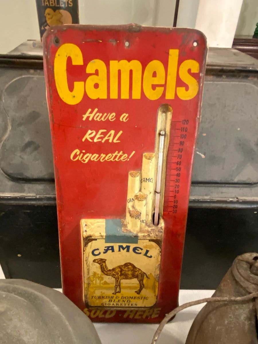 A classic piece of 'Petroleana' and tobacco advertising, this lithographed tin thermometer features the iconic Camel pack and the mid-century slogan 'Have a REAL Cigarette!'.
