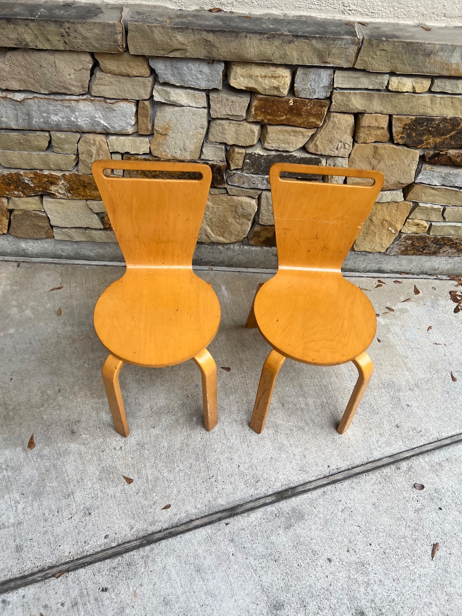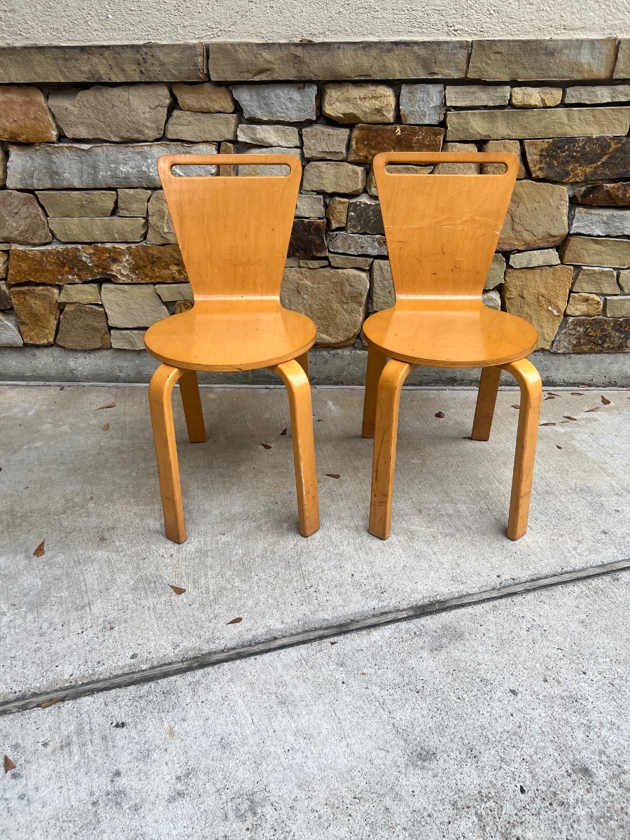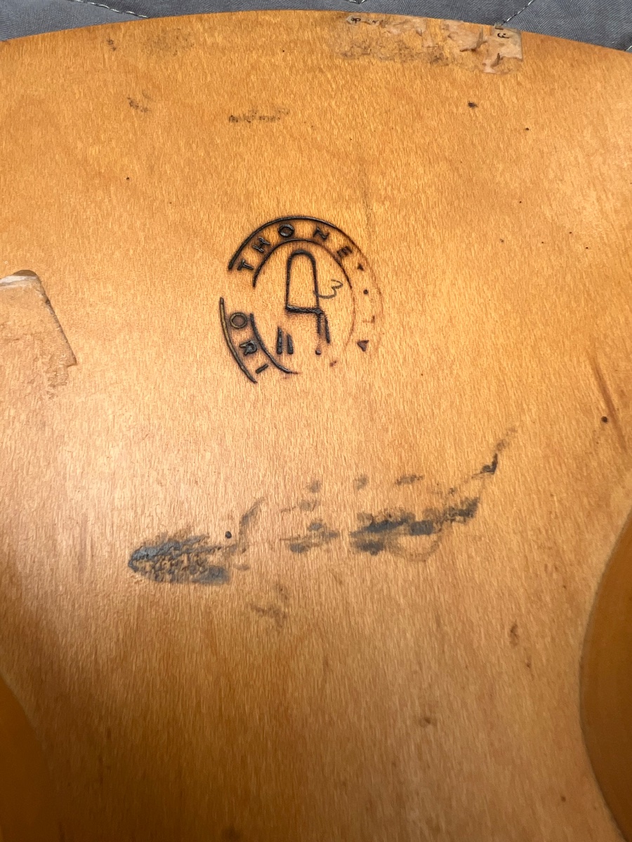 The chairs show significant signs of their history, including surface scuffs, scratches, and finish loss consistent with institutional use. The Thonet brand is highly collectible, but value is currently tempered by the significant surface wear.
