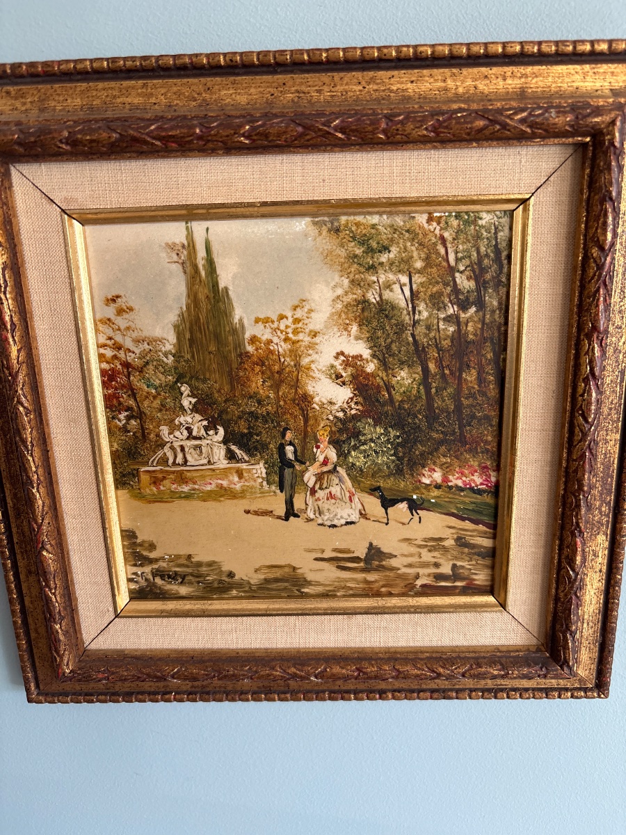 A charming 'Fête Galante' style painting depicting a courting couple and their hound in a lush, romanticized garden.
