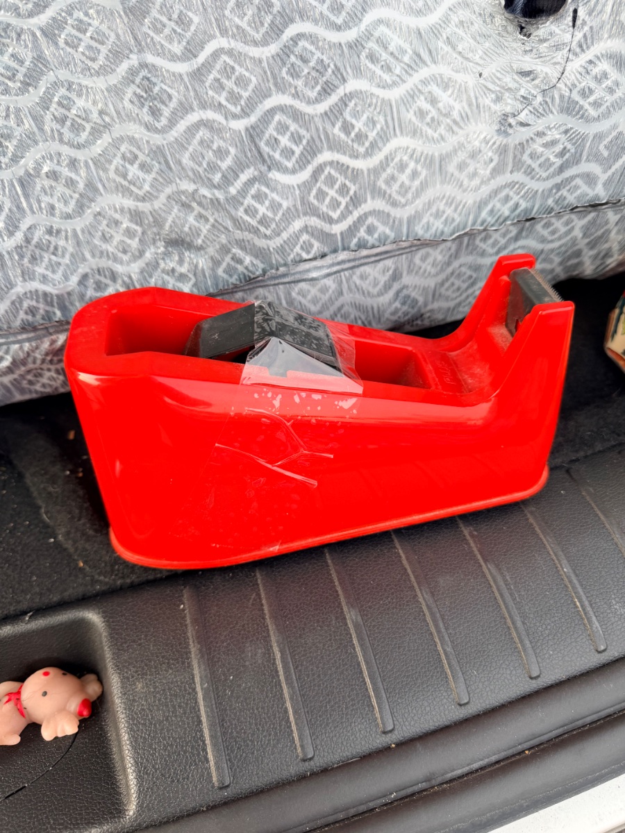 A striking example of Japanese industrial design, this heavy-duty tape dispenser features a bold, sculptural form in high-gloss 'Ferrari Red' ABS plastic.