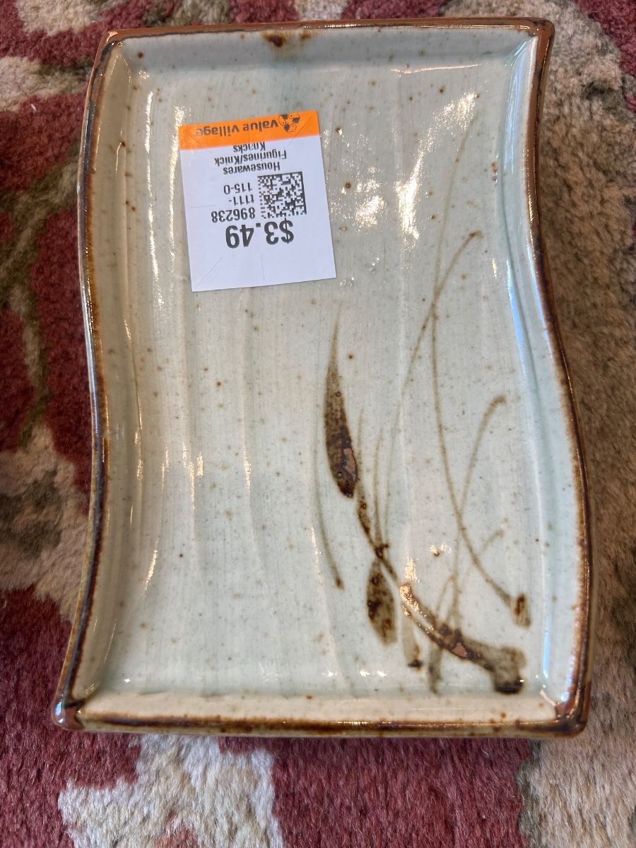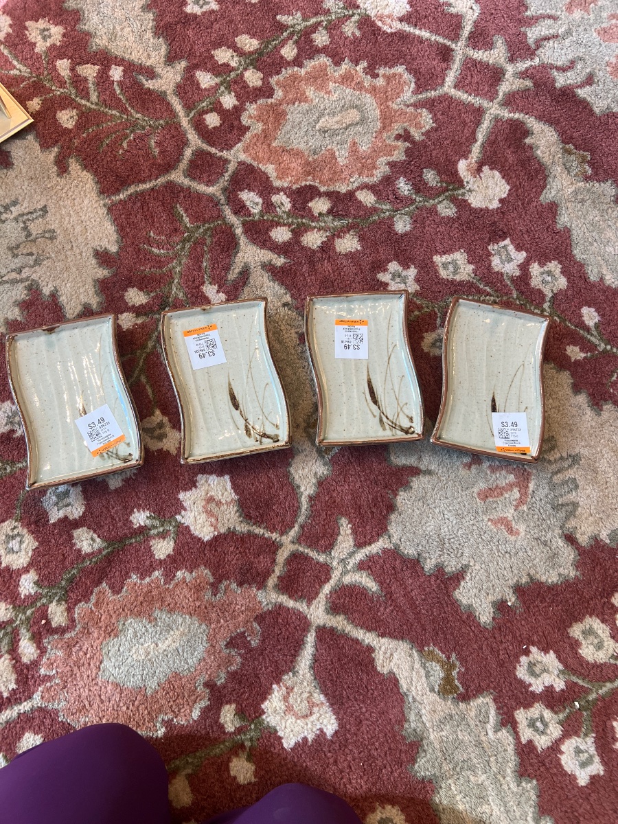 The plates appear to be in excellent vintage condition with no visible chips, cracks, or 'crazing' (fine surface cracking). While purchased at a thrift price, a set of four signed studio pieces in this condition typically sells for $15-$30 per plate in vintage boutiques or specialized ceramic…