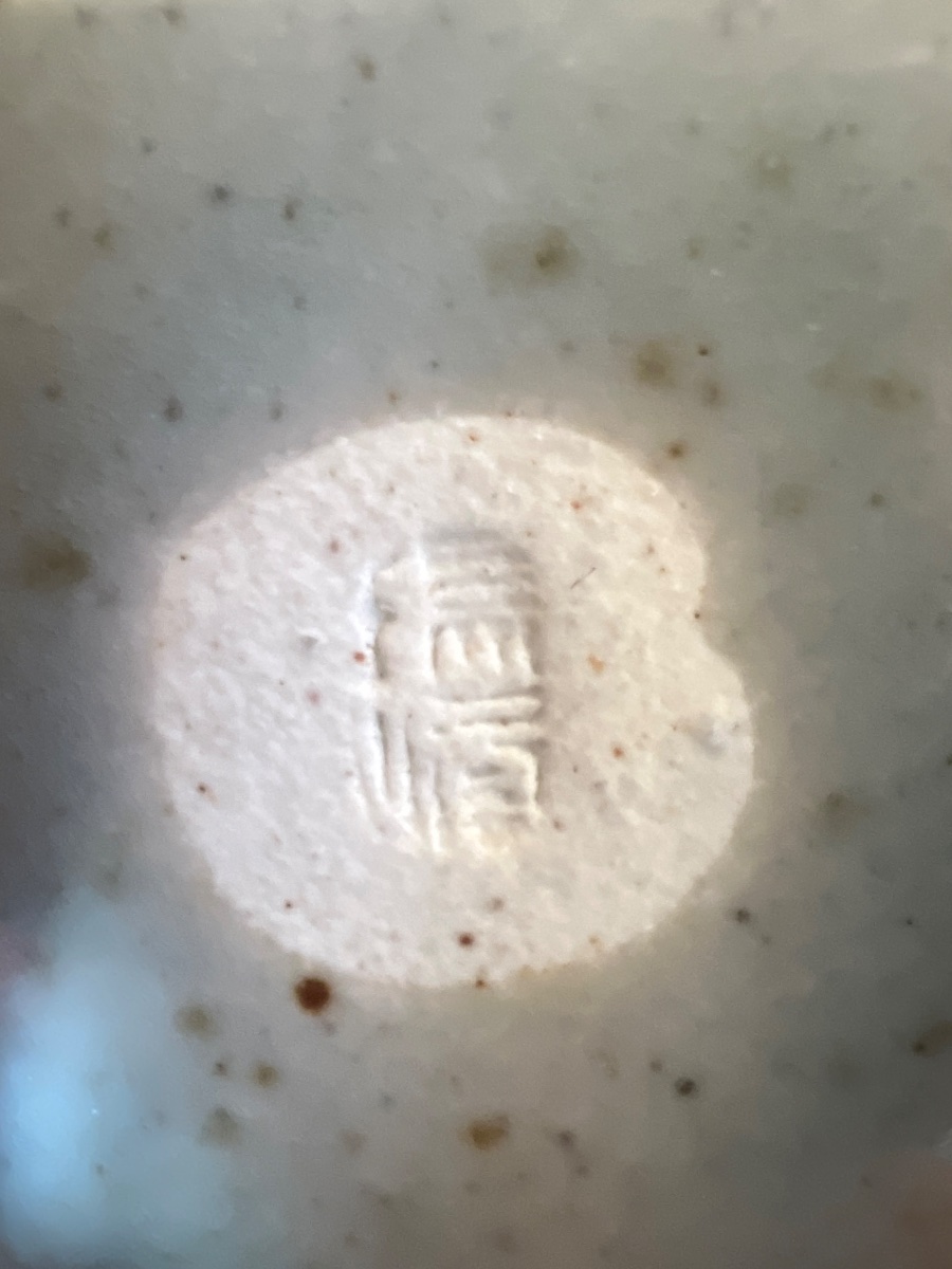 The impressed seal on the underside appears to be the kanji '信' (Shin), which is frequently associated with the Shigaraki region or a specific studio artist working in that tradition.