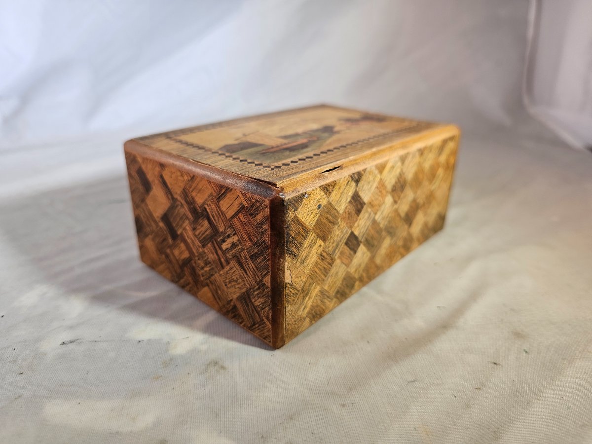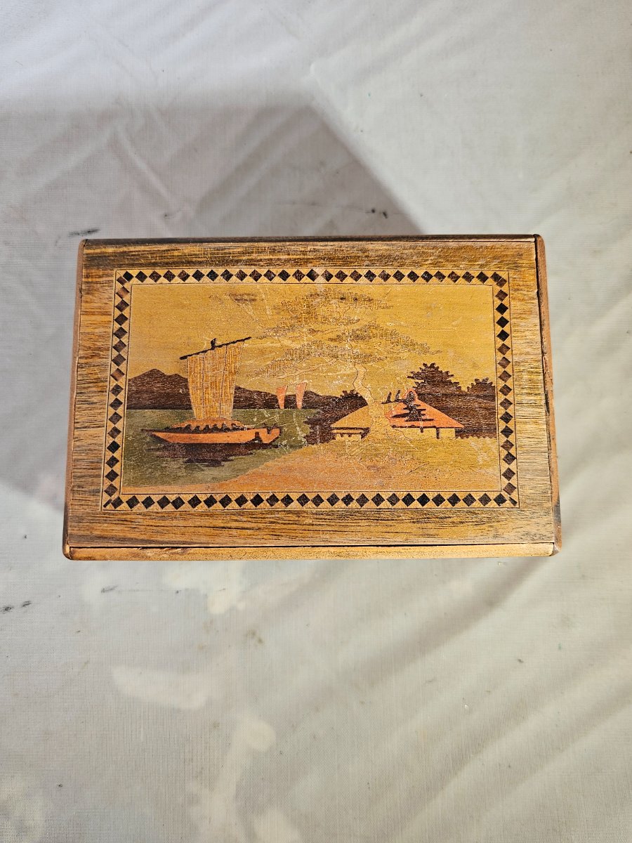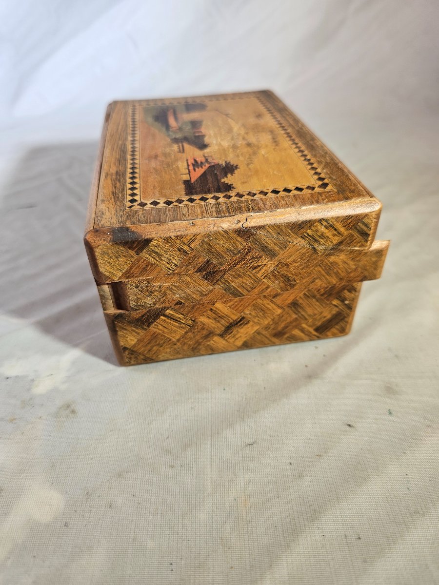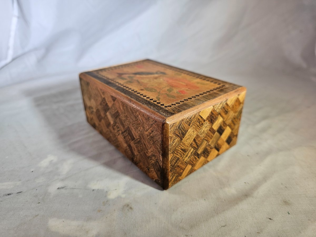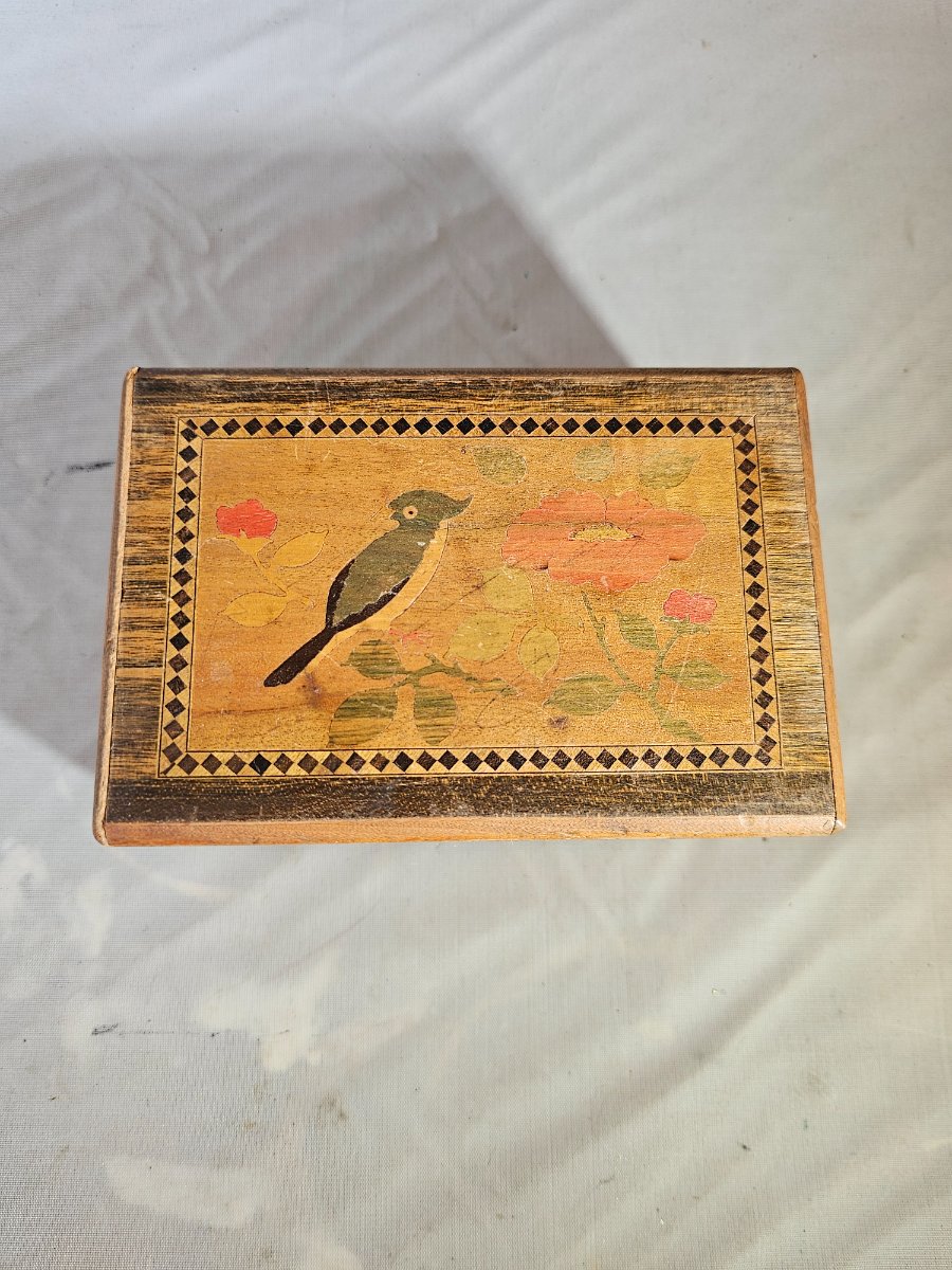 The box shows significant signs of age, including surface abrasions, fading of the pigments on the bird, and a notable crack in the veneer on the landscape side. While highly collectible, the value is tempered by the visible wear and cracking in the veneer.