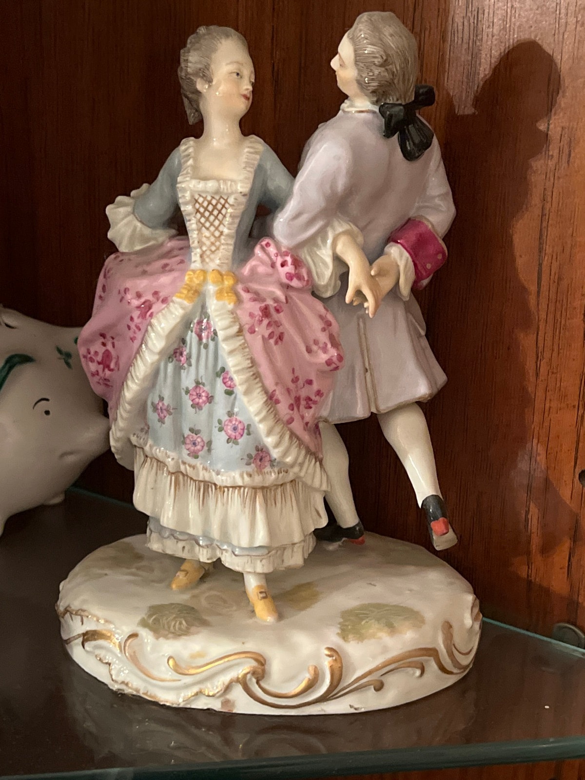 A classic hand-painted porcelain figurine depicting a man and woman in 18th-century 'Gallant' attire, frozen in a moment of dance or conversation.