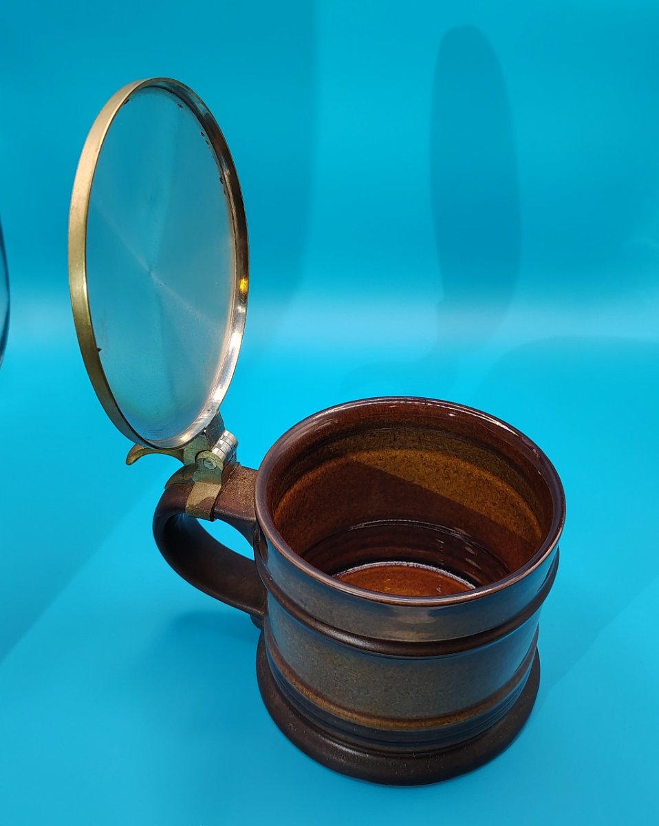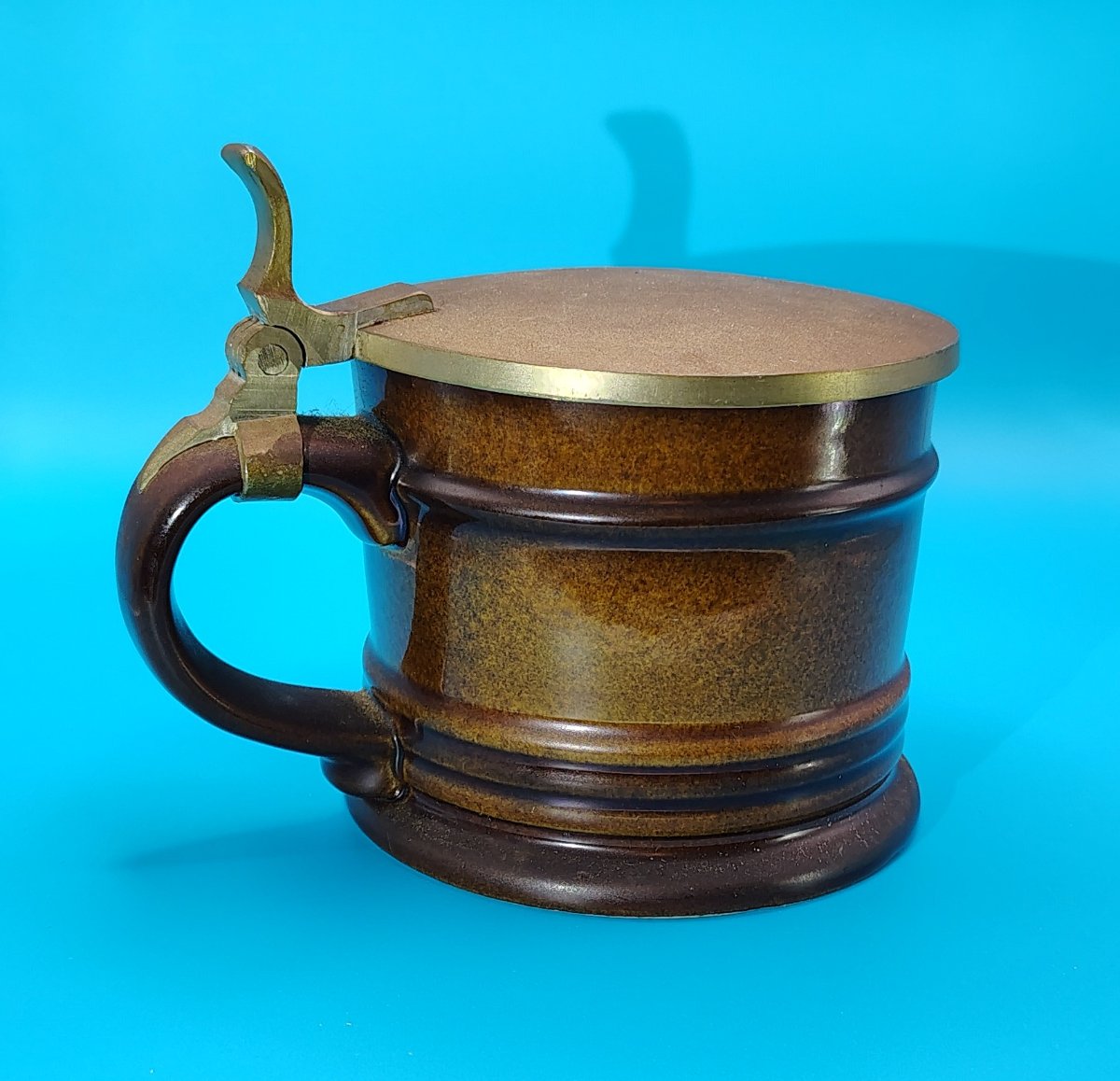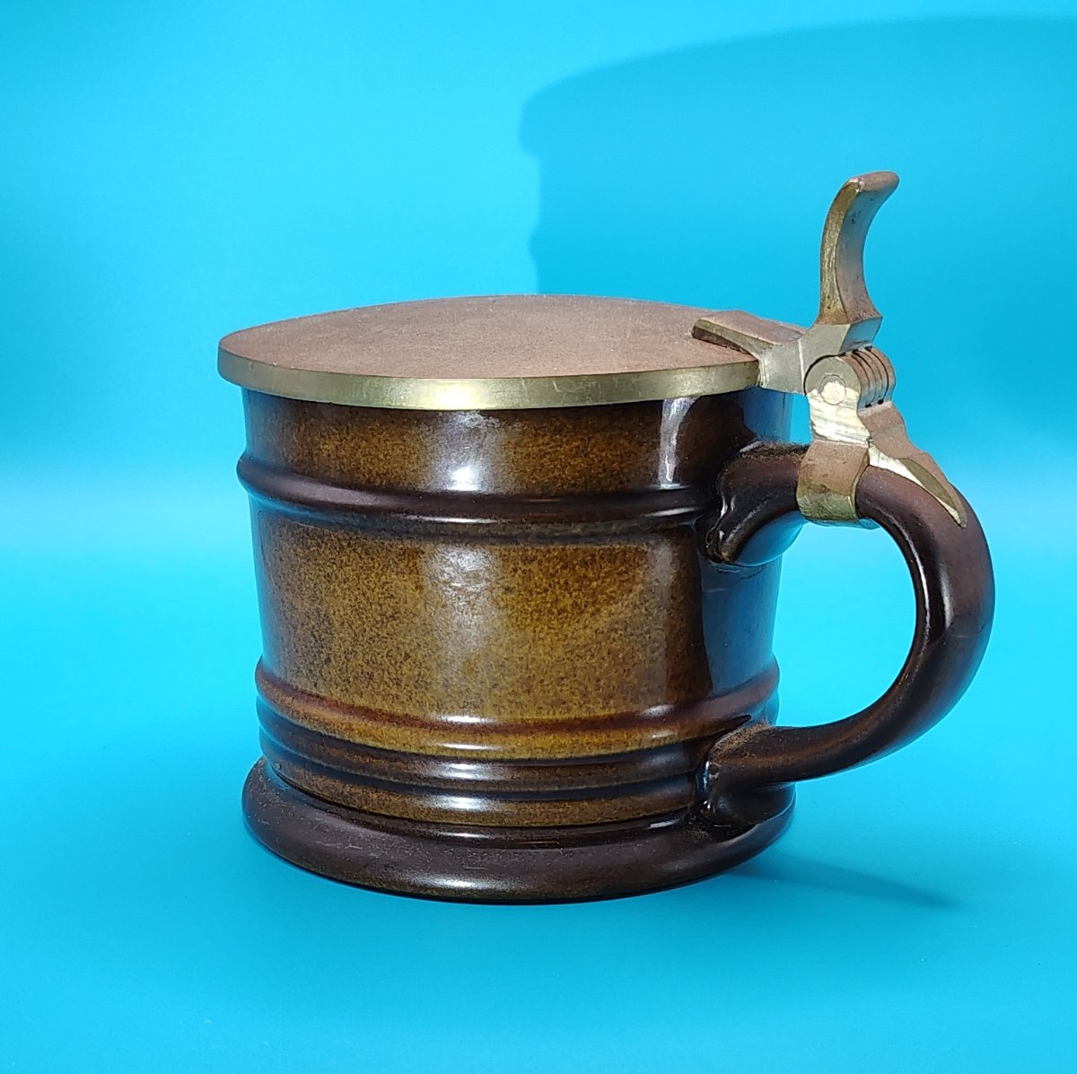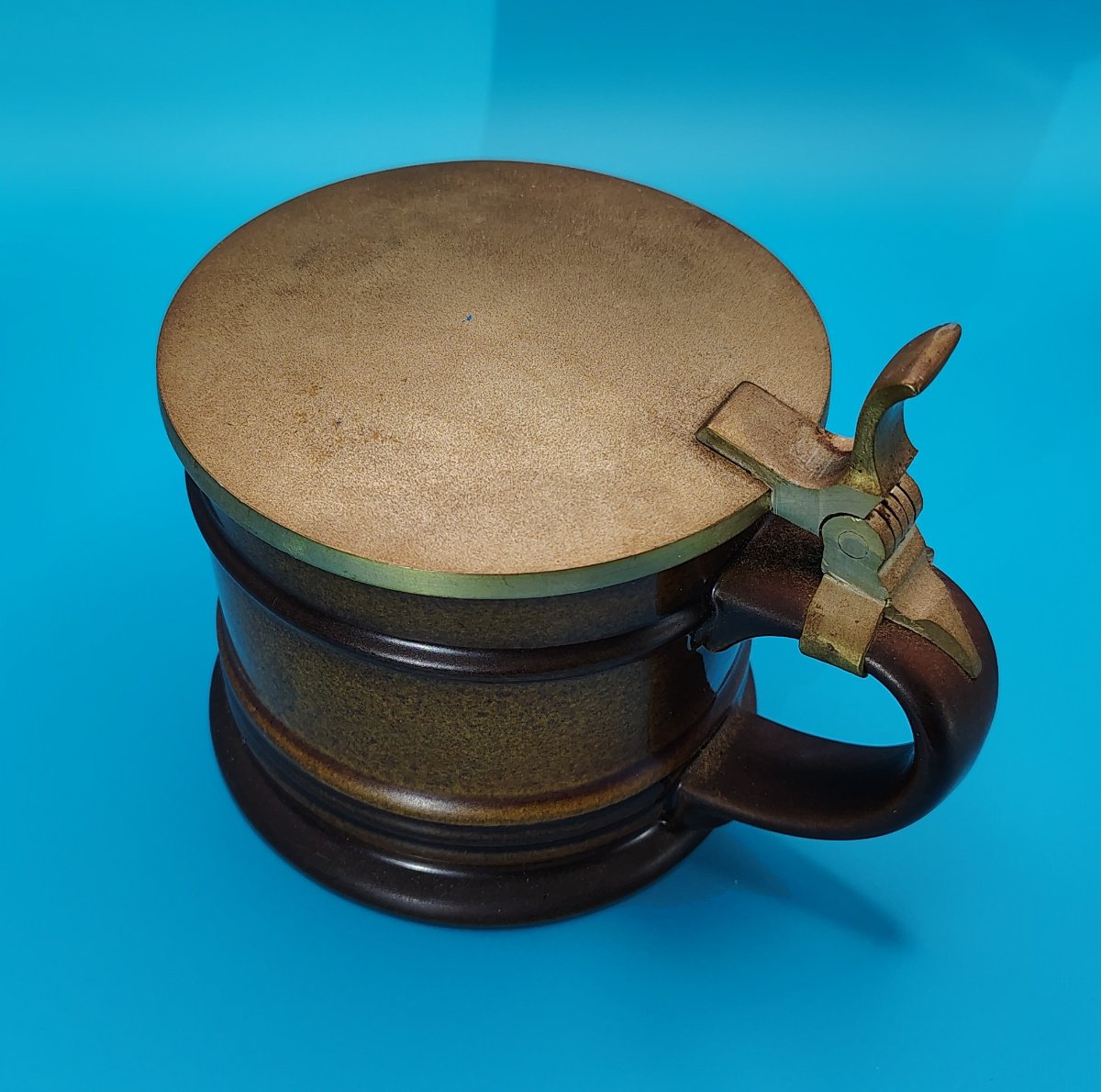 This is a robust stoneware beer stein from the 'Tobago' line, featuring a rich, speckled brown reactive glaze and a functional brass-toned lid.