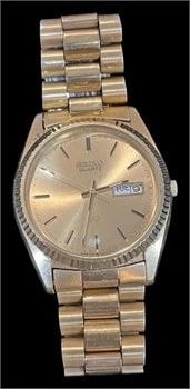 The photos show visible wear to the gold plating, particularly on the high-contact areas of the bracelet and the lugs. Value for vintage Seiko quartz models is driven by the condition of the gold plating and the functionality of the movement.