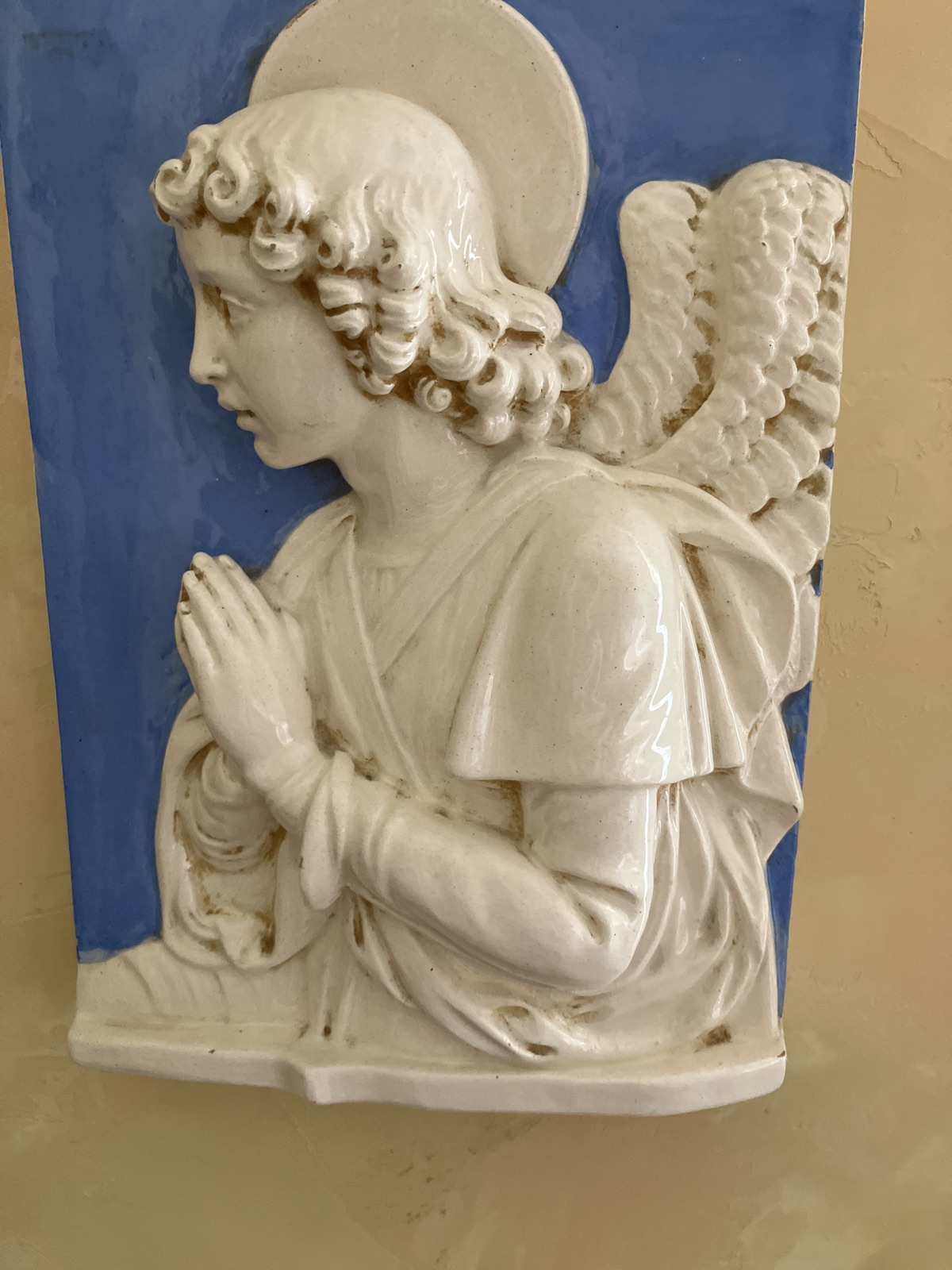 A high-relief ceramic plaque featuring a praying angel in profile, executed in the iconic white and cobalt blue tin-glaze style of the Italian Renaissance.