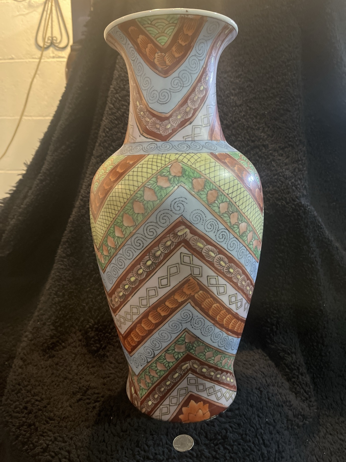 The vase appears to be in excellent vintage condition with vibrant enamel retention. Value is driven by the impressive size (indicated by the coin) and the unusual geometric pattern, which is more desirable to modern decorators than standard floral scenes.