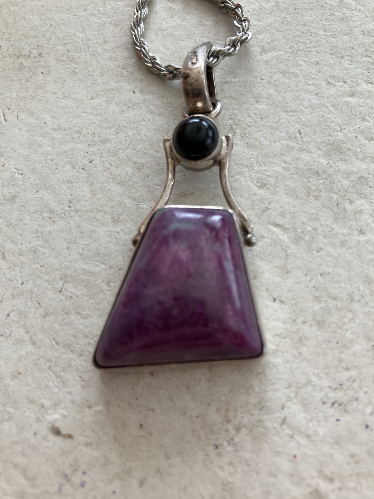 A striking trapezoidal cabochon of ruby-rich zoisite suspended from a sterling silver architectural frame.