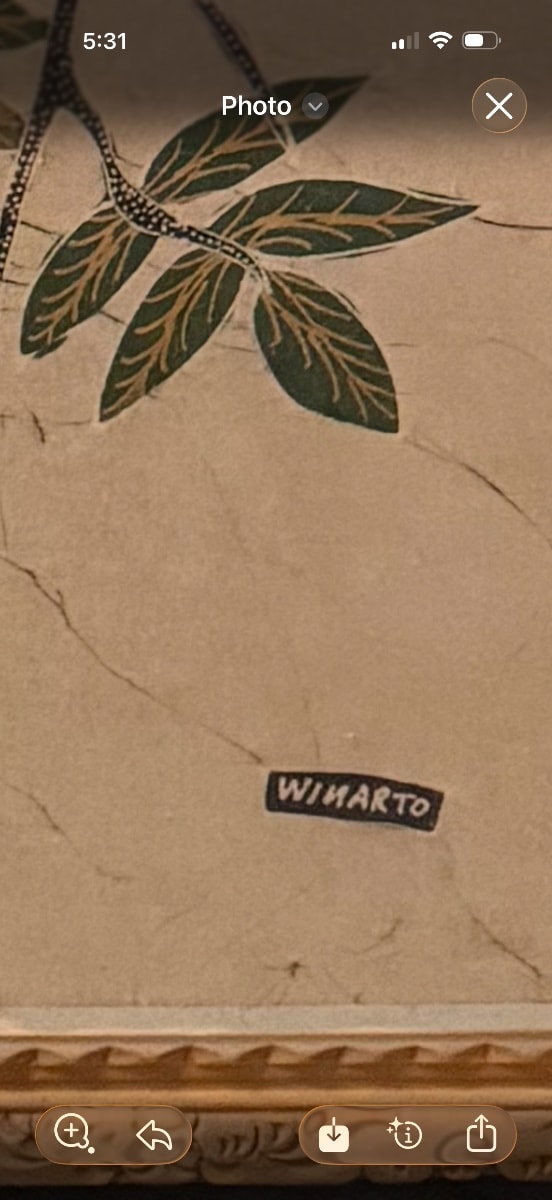 Based on documentary provenance, the artwork is signed "WIHARTO" (initially interpreted as 'Wimarto'), a common Indonesian surname. Exhaustive database research across primary auction records (Sotheby's, Christie's, Bonhams) does not list Wiharto as a globally tracked fine art master; therefore, the maker is categorized within the skilled Artisan/Decorative tier. During the 1960s and 1970s, regions like Yogyakarta and Solo in Java became epicenters for contemporary batik painting. Artisans began evolving the traditional wax-resist dyeing process—historically used for clothing and recognized by UNESCO as intangible cultural heritage—into a sophisticated medium for fine art wall hangings. While Wiharto does not command the high-tier secondary market prices of "Batik Brahmins" like Amri Yahya or Chuah Siew Teng, the inclusion of an artist's signature indicates formal pride of authorship and places this piece firmly within the recognized regional movement of mid-century Javanese picture-making.