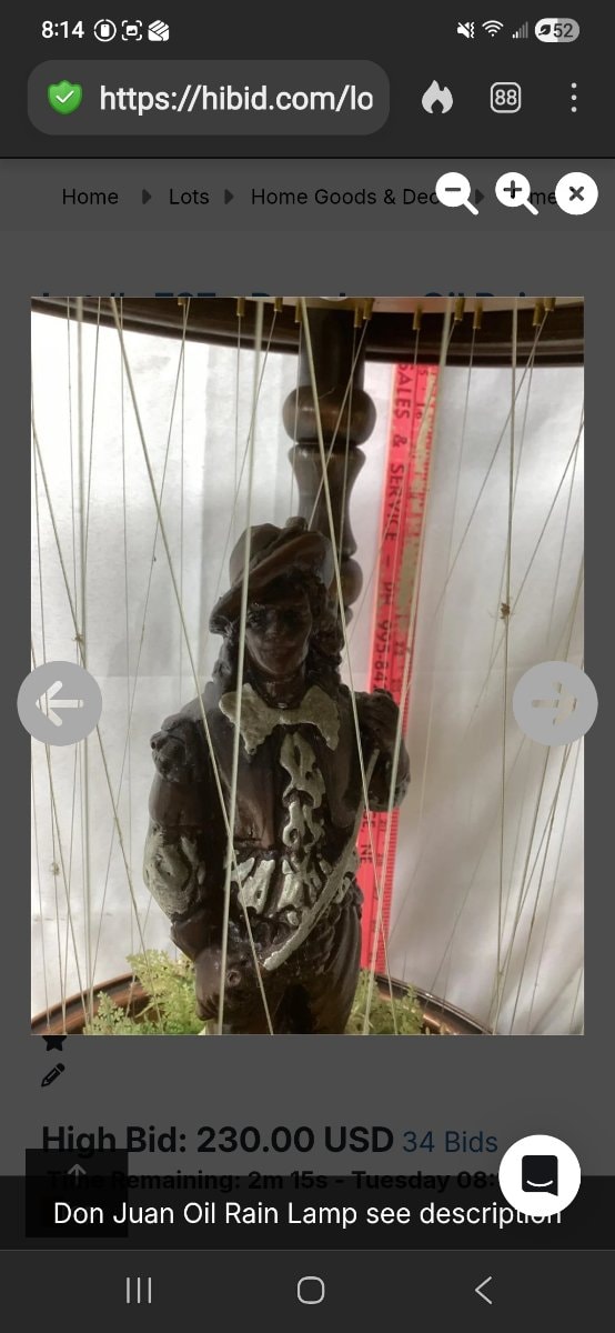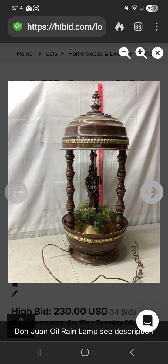 The market for vintage 1970s rain lamps has seen a strong resurgence over the past 36 months, driven by millennial and Gen Z collectors favoring eclectic, retro interiors. The "Don Juan" model carries a recognized 20% to 40% premium over the ubiquitous goddess models due to its comparative rarity. Fully functioning, unrestored original examples consistently clear between $300 and $525 in national marketplaces like eBay and Etsy. However, valuation is heavily bifurcated by condition: lamps with burned-out motors or tangled lines suffer a severe "restoration burden" penalty, dropping the market floor to the $150–$200 range, as restringing requires over 40 feet of line and specialized labor. Because this specific piece is headed to a local/regional HiBid auction, the hammer price may skew toward the lower half of the estimate unless explicitly marketed as fully functional and professionally drained for transport.