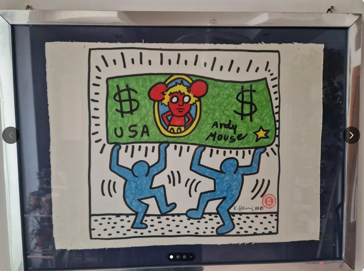 This estate-authorized offset lithograph of Keith Haring's iconic 'Andy Mouse' (Plate 3 motif) represents the accessible tier of the artist's market, published by teNeues circa 1988-1993. While original 1986 silkscreens from this series command $150,000-$300,000 at auction (with a complete set achieving $1.76 million in April 2025), this vintage commercial reproduction occupies the decorative poster market at $150-$300, as evidenced by recent sales at DUMBO Auctions ($150, September 2023) and Roseberys London ($200-$300, March 2023). The image brilliantly captures Haring's tribute to mentor Andy Warhol, depicting two radiant figures hoisting a dollar bill featuring Warhol-as-Mickey-Mouse—a commentary on art's commodification that remains culturally resonant. Value is driven by the official Keith Haring Foundation authorization, the work's vintage status (distinguishing it from modern reproductions), and current market strength for 1980s Pop Art ephemera.