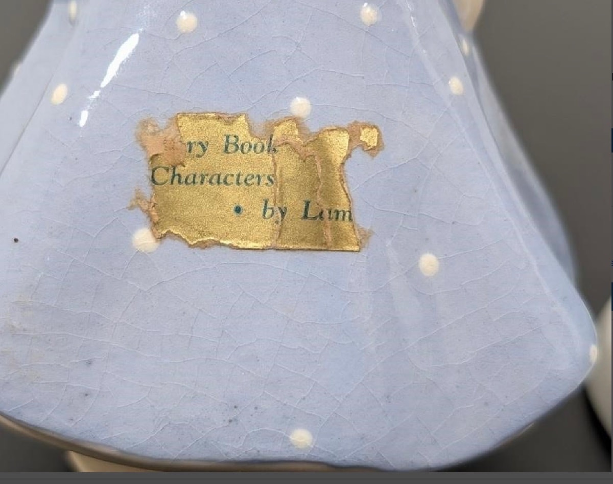 A pair of c. 1950s 'Story Book Characters' ceramic figurines. Validating the owner's claims against the initial classification, research confirms these are products of Lamar of California, a mid-century American pottery manufacturer, rather than Japanese imports. The 'Story Book Characters by Lum' foil label represents a specific distribution line or localized retail branding. Valuations in this niche are highly dependent on condition, and the estimated fair market value for the pair is anchored by recent secondary market sales of individual and bulk Lamar nursery pieces.