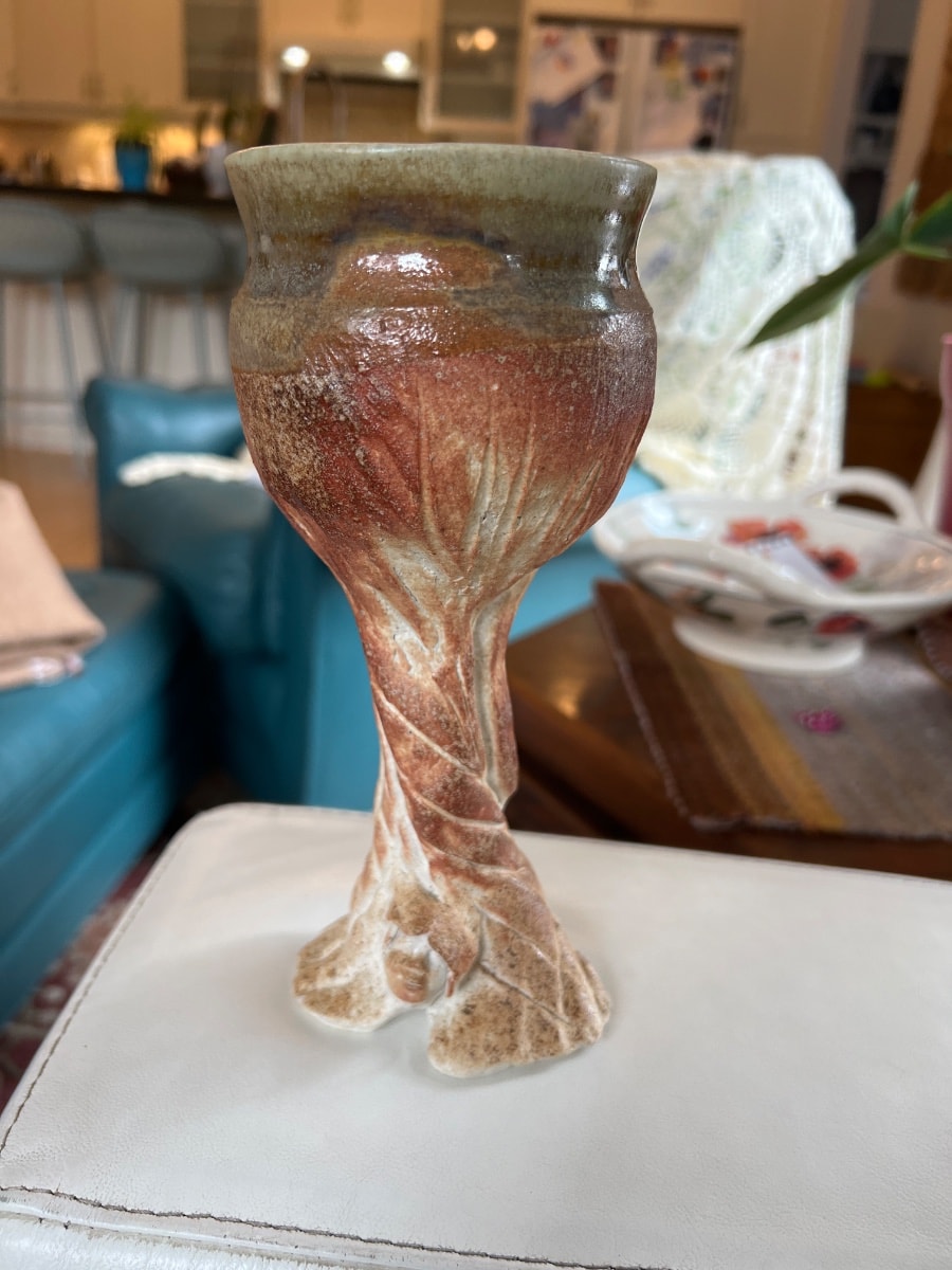 These goblets were produced by an unidentified American studio potter active during the late 20th century (c. 1970s–1990s), a period that saw a flourishing grassroots movement in fantasy, folklore, and 'Renaissance Faire' artisanal crafts. Artisans of this era often rejected industrial perfection in favor of highly textured, organic stoneware that utilized earth-toned rutile and iron glazes to evoke natural elements like bark and stone. The 'Wood Spirit' or 'Green Man' motif—a face emerging from natural foliage or wood grain—became a staple of this movement, blending Anglo-Celtic mythology with functional studio pottery.