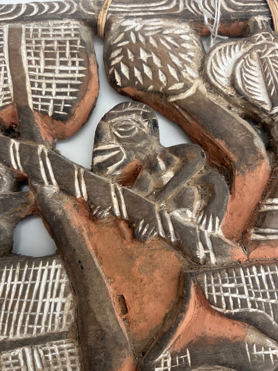 The 'storyboard' is a distinct ethnographic art form that originated in the 1960s among the Kambot people of the Keram River, a tributary of the Lower Sepik in Papua New Guinea. Prior to this innovation, Kambot artists painted traditional village scenes and spiritual narratives on flat, fragile pieces of sago palm bark to decorate the interior gables of their 'Haus Tambaran' (men's spirit houses). Recognizing the fragility of these bark paintings, a missionary named Brother Joseph Schrader encouraged local carvers to adapt their visual language to a more durable medium suitable for the growing expatriate and tourist market.