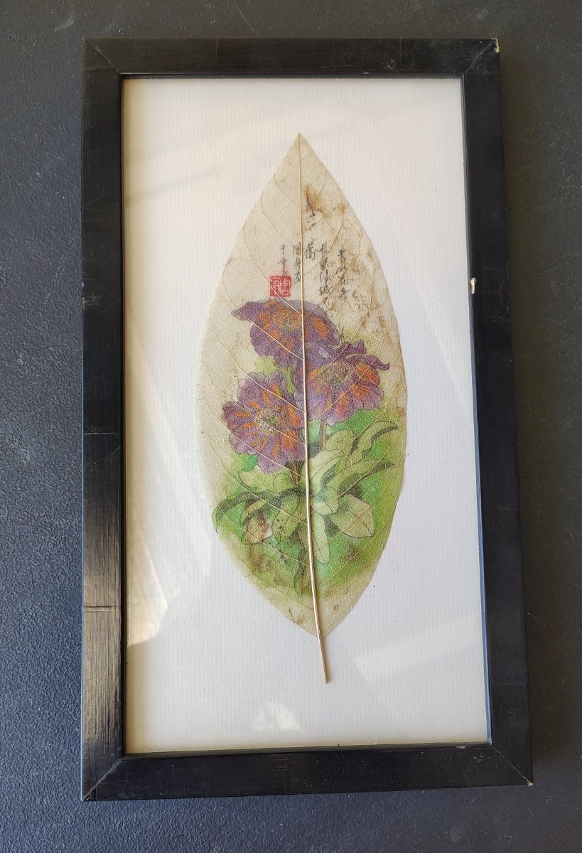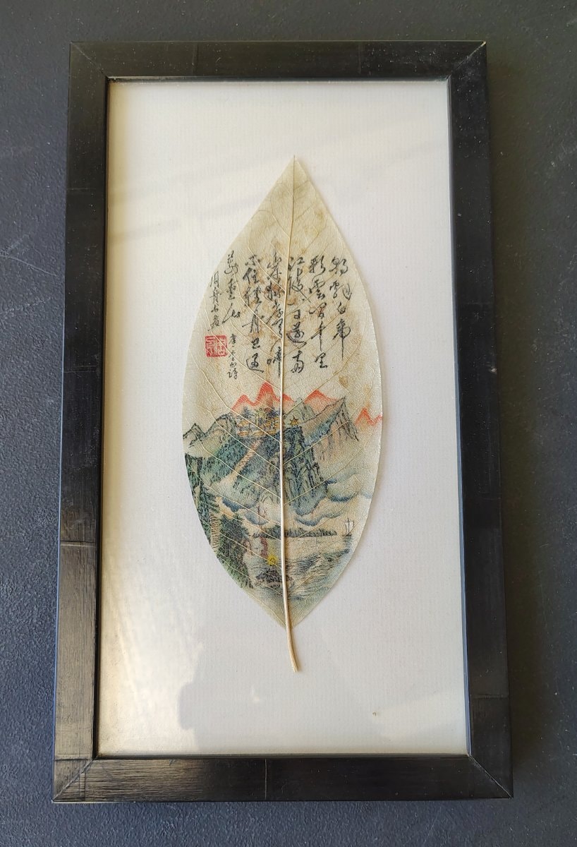 Painting on the leaves of the Bodhi tree (Ficus religiosa) is a tradition deeply rooted in Chinese and broader Asian religious history. Buddhist monks originally utilized these sacred leaves as canvases for religious icons and calligraphy, believing the leaf's intricate vascular network mirrored the interconnectedness of all living things. Historically, the finest examples date to the Ming and Qing dynasties and are held in high esteem at major auction houses and institutions. By the mid-to-late 20th century, this spiritual and meticulous practice had been adapted into a highly specialized folk and export art. The creation process is labor-intensive: the organic leaf is submerged in water or an alkaline solution for weeks until the fleshy cellular tissue degrades. The remaining vascular network—the 'skeleton'—is carefully brushed clean, dried, and sometimes bleached. It is then mounted to a solid paper or silk support and painted with fine brushes using gouache or opaque watercolors. While these late 20th-century examples rarely feature individual master artist signatures (the red seals and inscriptions typically provide poetic context rather than a specific maker's name), they represent an important craft tradition that surged in popularity as China reopened to Western tourism in the late 1970s and 1980s.