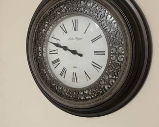 This is a contemporary, mass-produced decorative wall clock designed to emulate the styling of 19th-century British station or parlor clocks. Featuring the fantasy mark 'London England' on the dial, the piece operates via a modern battery-powered quartz movement and holds no antique horological value. Value is anchored entirely by its decorative appeal, scale, and condition as secondary-market home decor. While exact manufacturer attribution is unavailable, market comparables for similar vintage-style statement clocks consistently place its fair market value in the $25 to $75 range depending on its exact dimensions and material construction.