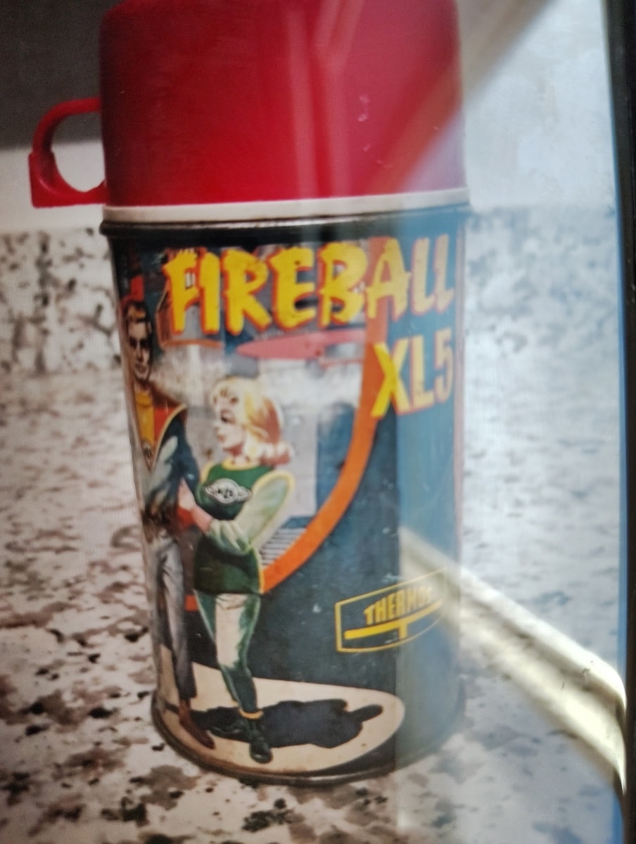 A classic lithographed steel vacuum bottle featuring Colonel Steve Zodiac and Venus from Gerry Anderson's 'Fireball XL5'. This piece is a quintessential artifact of the 1960s 'Supermarionation' craze and the global obsession with the Space Race.