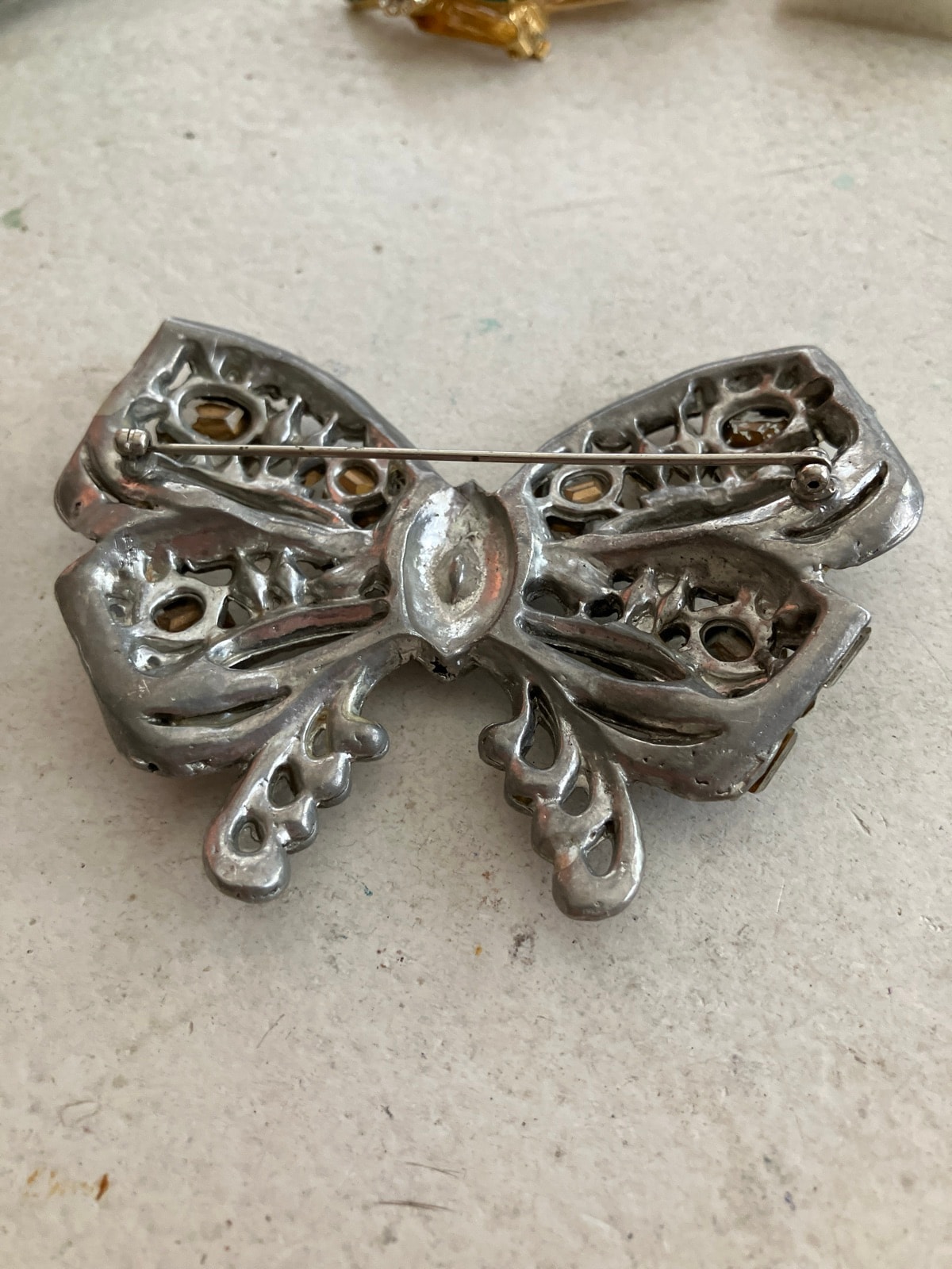 The stones show some 'greying' or 'deadening' typical of aging foil backings, and there is visible oxidation on the metal reverse. However, the structural integrity and pin mechanism appear sound. The presence of all stones is a major plus. Value is driven by the large scale and the fact that all stones appear present.