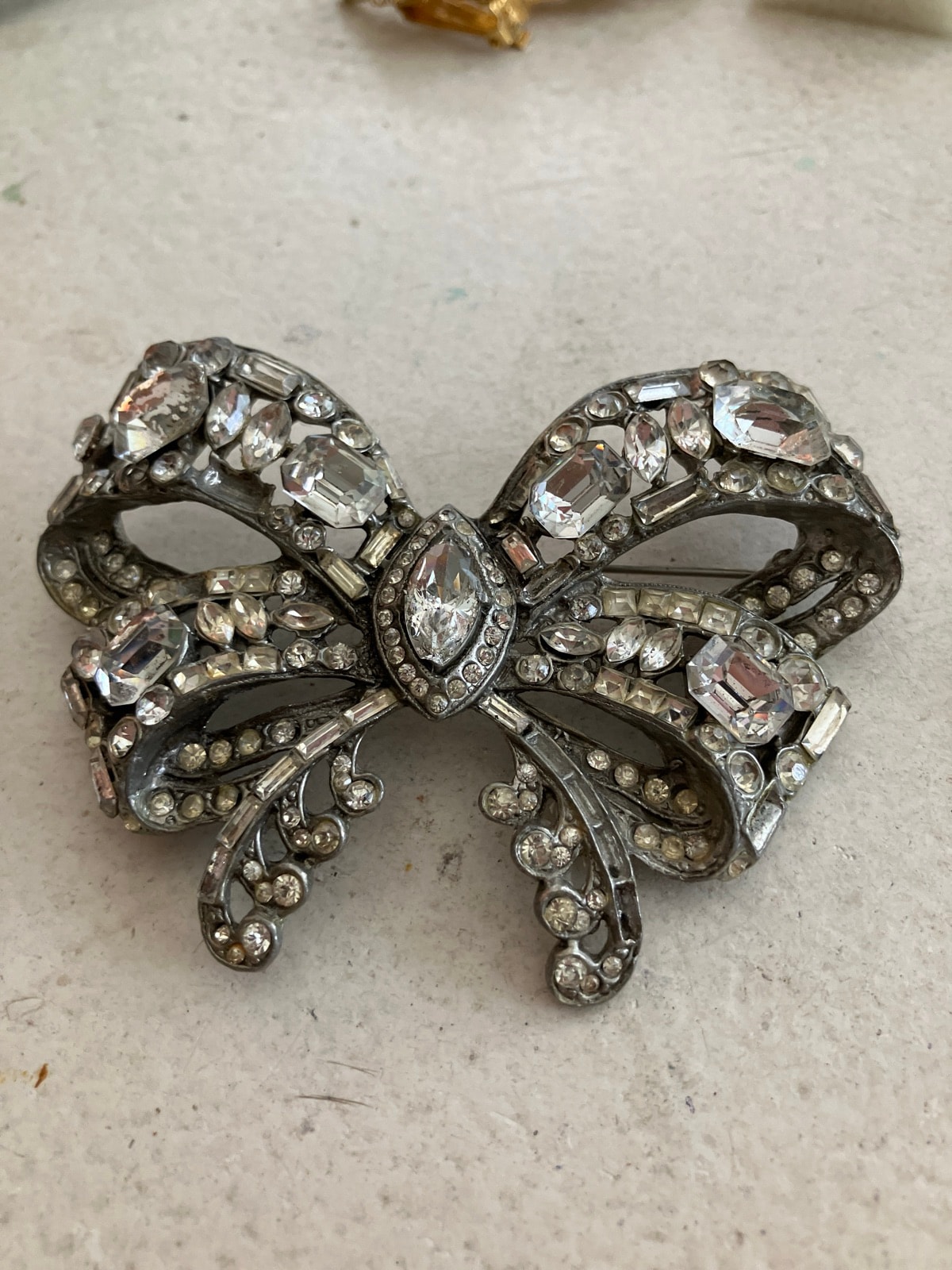 During the 1940s, wartime metal shortages forced designers to get creative with 'pot metal' and glass. This bow represents the era's love for bold, feminine symbols that offered a touch of Hollywood glamour during lean years.