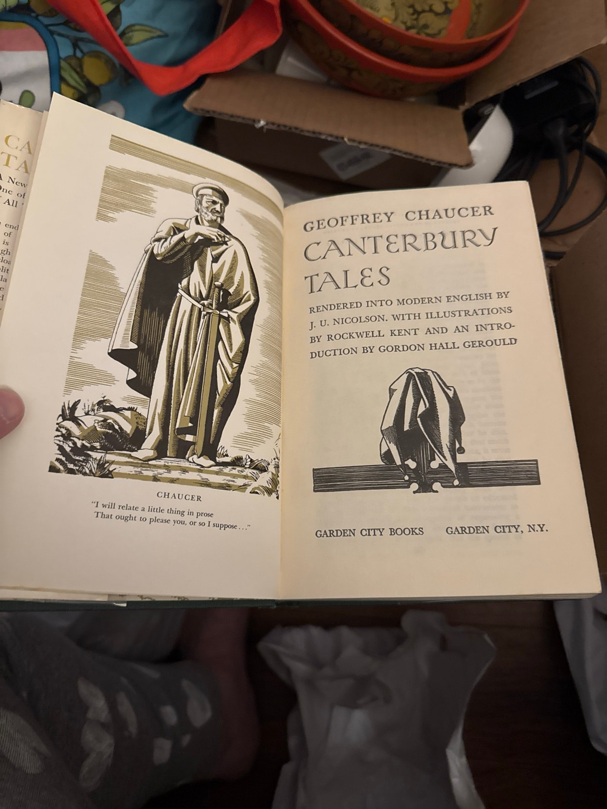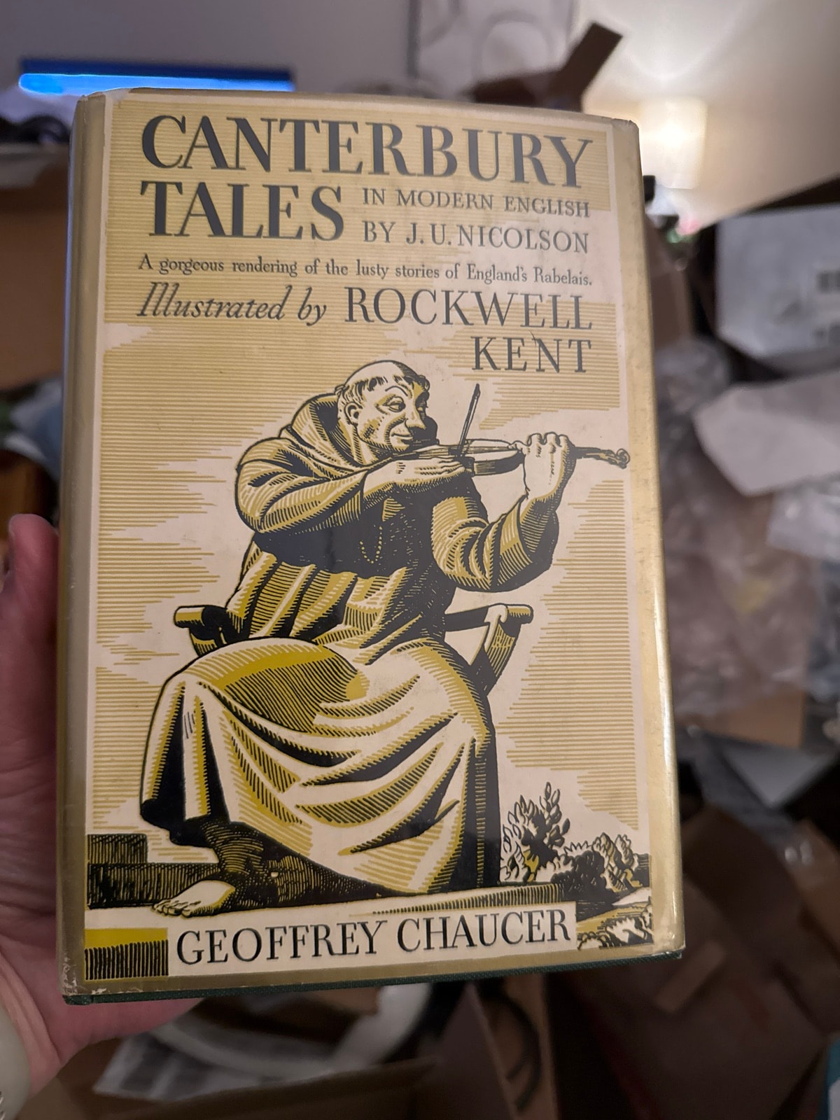 This is the first trade edition of Geoffrey Chaucer's 'Canterbury Tales' featuring the iconic illustrations of Rockwell Kent. Rendered into modern English by J.U. Nicolson, this volume brought Kent's bold, woodcut-style imagery to a mass audience during the Great Depression.
