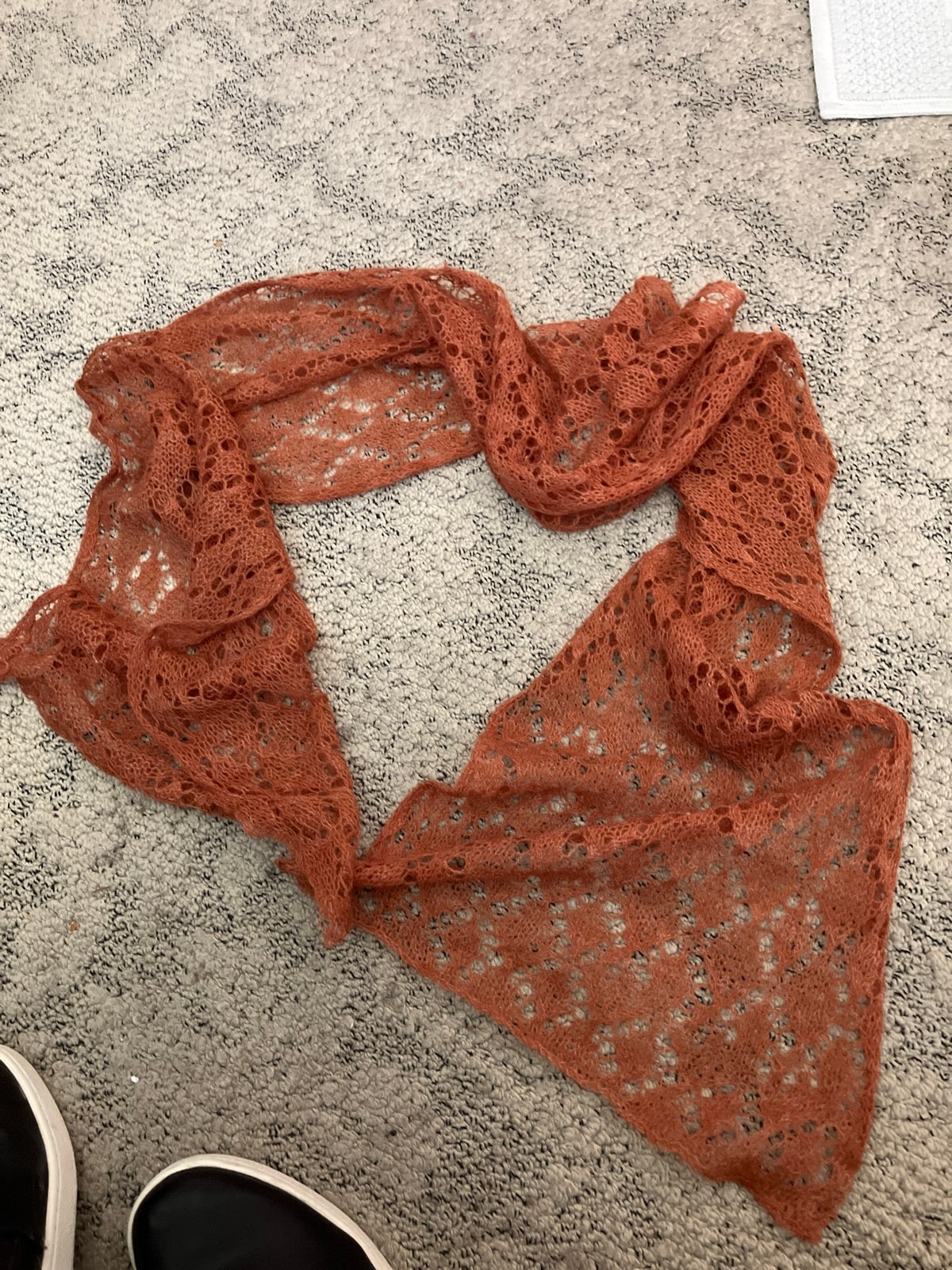 A delicate, hand-knit triangular shawl featuring an intricate openwork lace pattern in a rich terracotta or rust-colored mohair blend. This piece represents the 'wedding ring shawl' tradition, where the knit is so fine it can be pulled through a band.