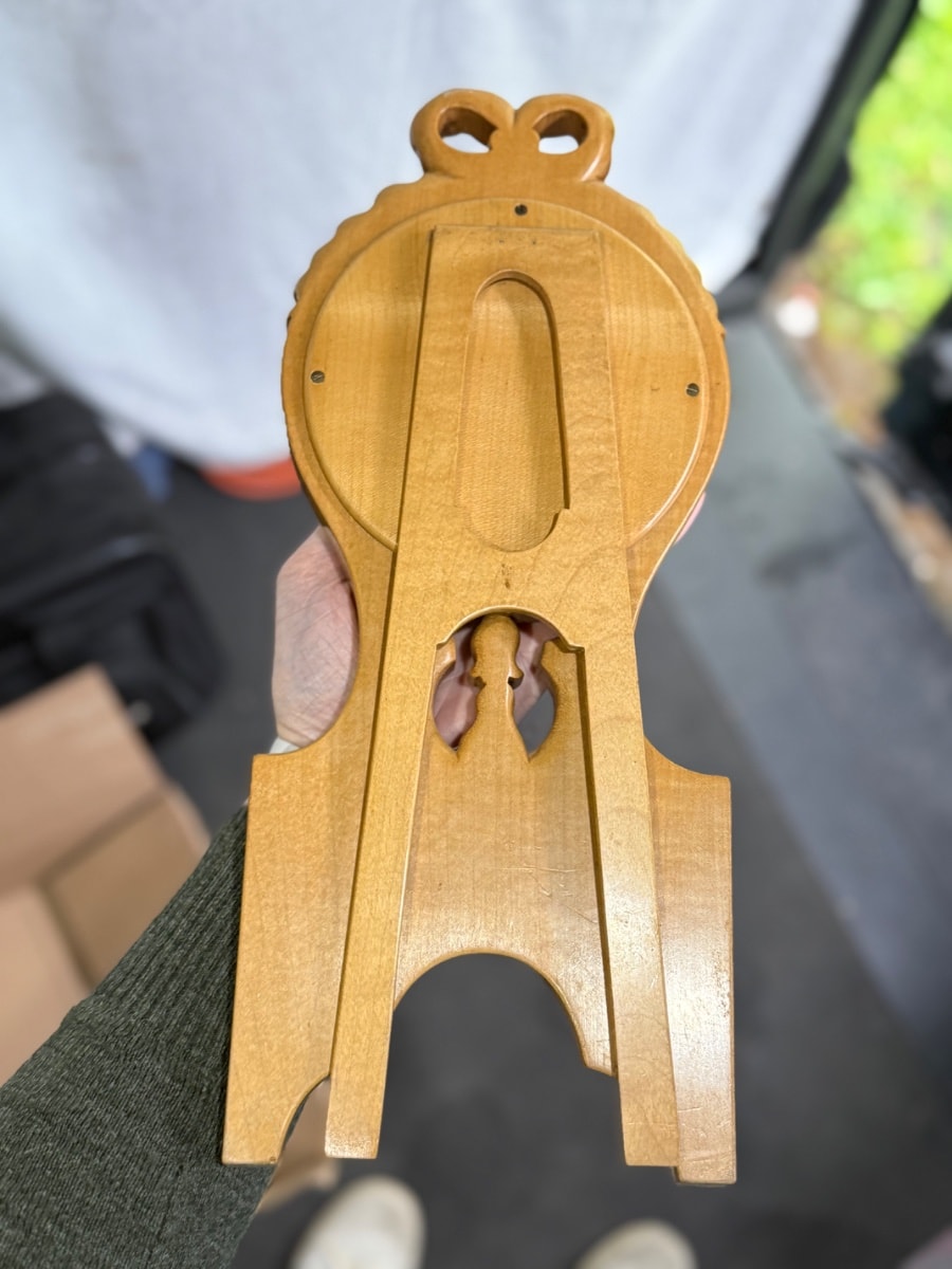 A masterfully carved desk accessory in the Neoclassical style, featuring a pierced ribbon-bow crest and delicate floral garlands. It houses an original Fahrenheit spirit thermometer and a circular aperture designed to hold a large 'Goliath' pocket watch or an aneroid barometer.